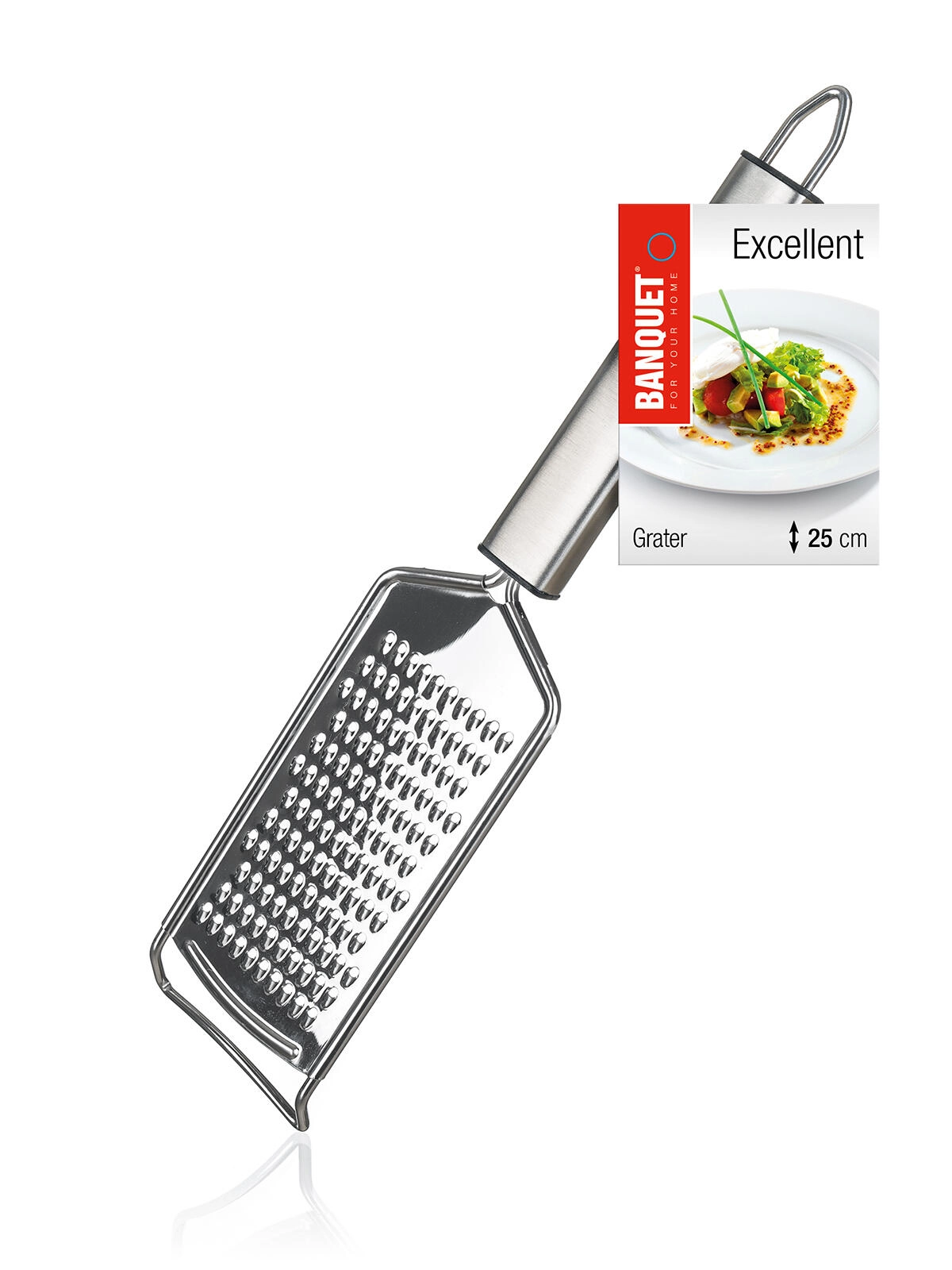 Opdag det pålidelige EXCELLENT køkkenrivejern i kvalitets rustfrit stål. Det er let, robust og designet til komfortabel og sikker brug. Med det ergonomiske håndtag og det praktiske ophængsøje kan du nemt opbevare det og have det lige ved hånden.
