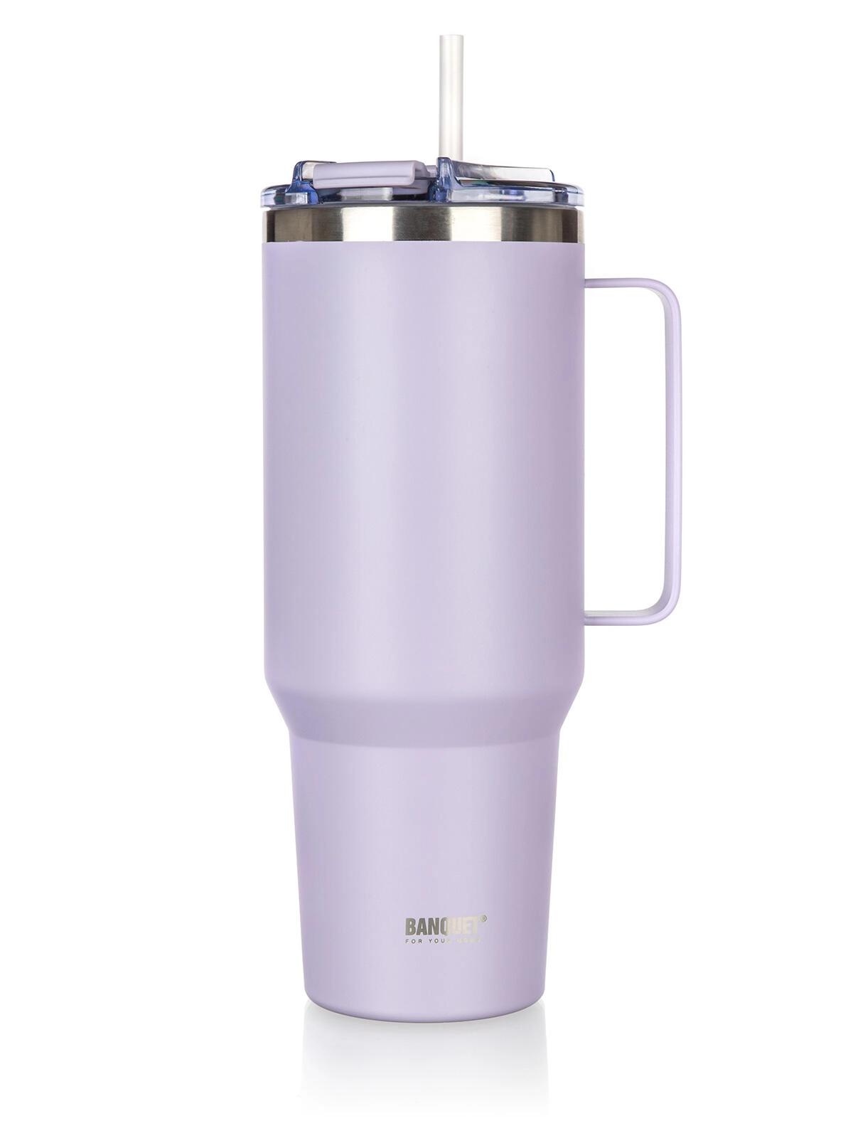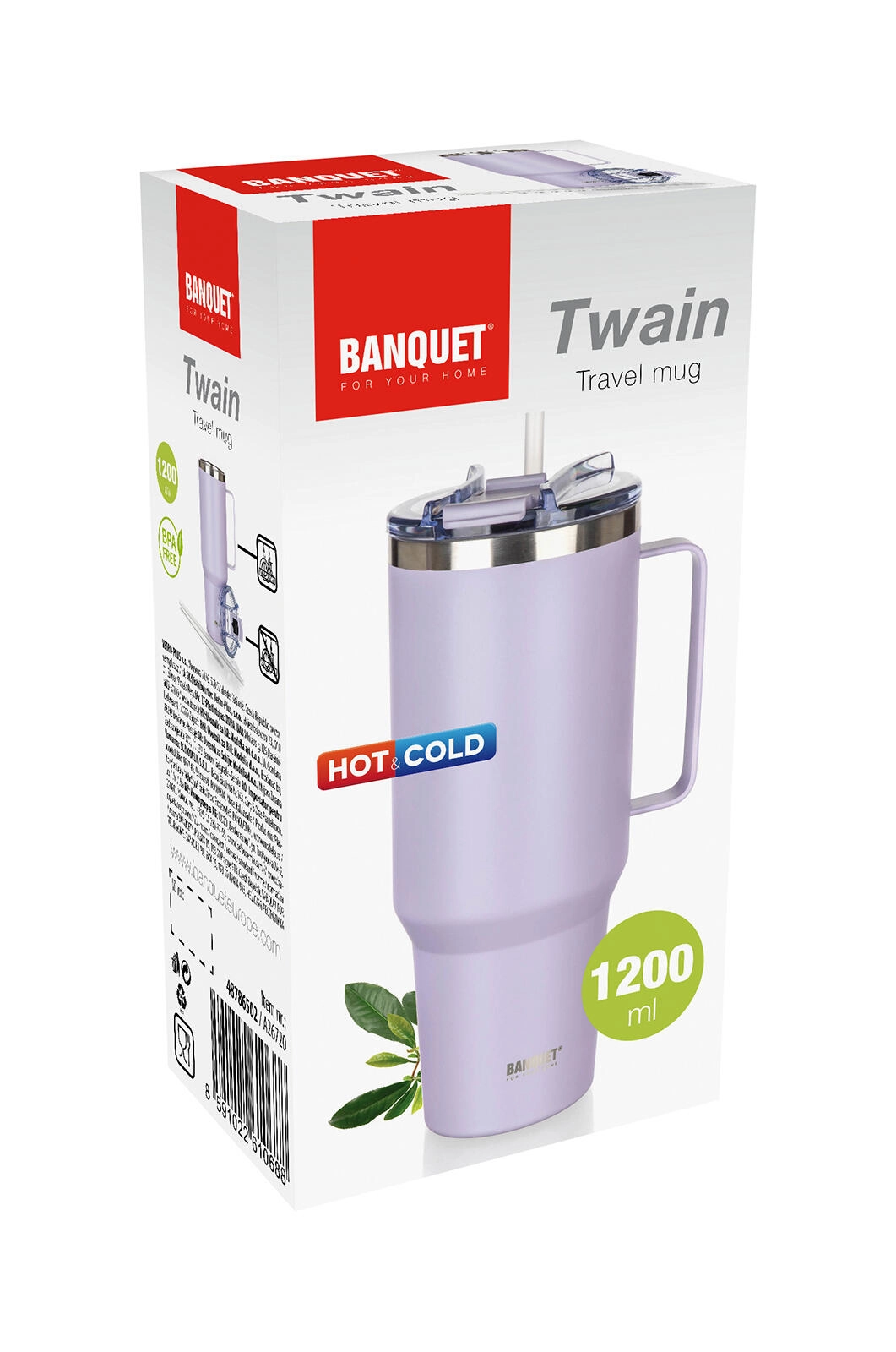 Stilfuldt rejse-termokrus TWAIN med kapacitet på 1200 ml i elegant lilla holder dine drikke ved den ønskede temperatur længere takket være dobbeltvægget vakuumisolation i rustfrit stål. Det tilbyder et praktisk låg med sugerør, en behagelig hank til nem transport og bred kompatibilitet med kopholdere i bilen takket være den tilspidsede bund.