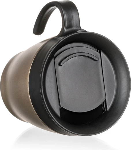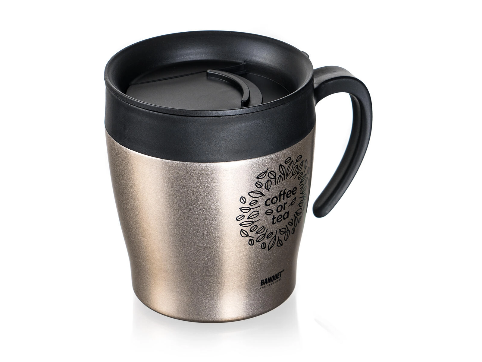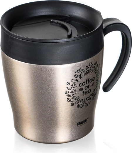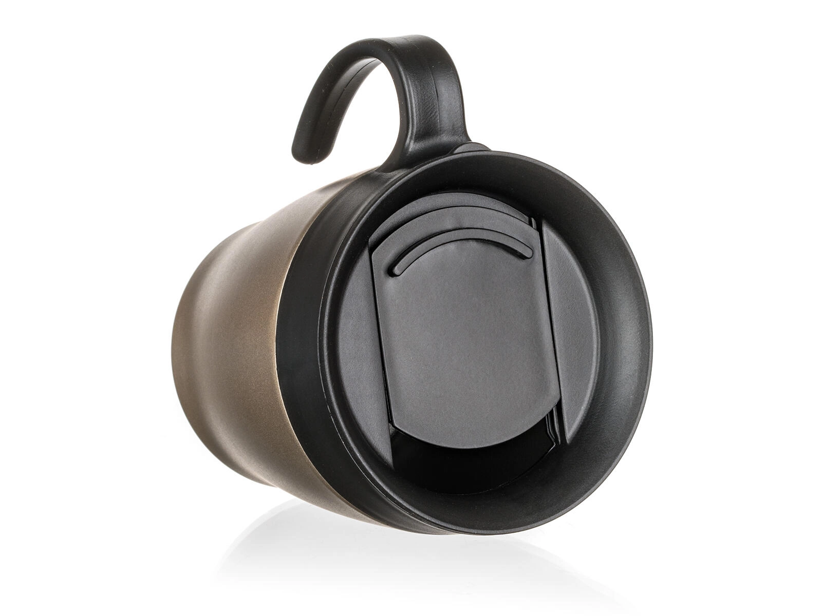 Det elegante TAZZA termokrus i beige metallic er ideelt til kaffe og te på farten. Takket være den vakuum-dobbeltvæggede krop i rustfrit stål (ydre 201, indre 304) holder det drikken i den ønskede temperatur i længere tid. Det ergonomiske håndtag og det praktiske låg med let drikning gør det til en fremragende ledsager i bilen, på kontoret og på gåture.