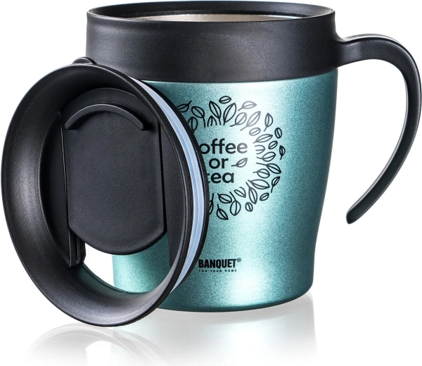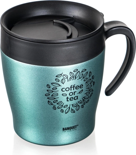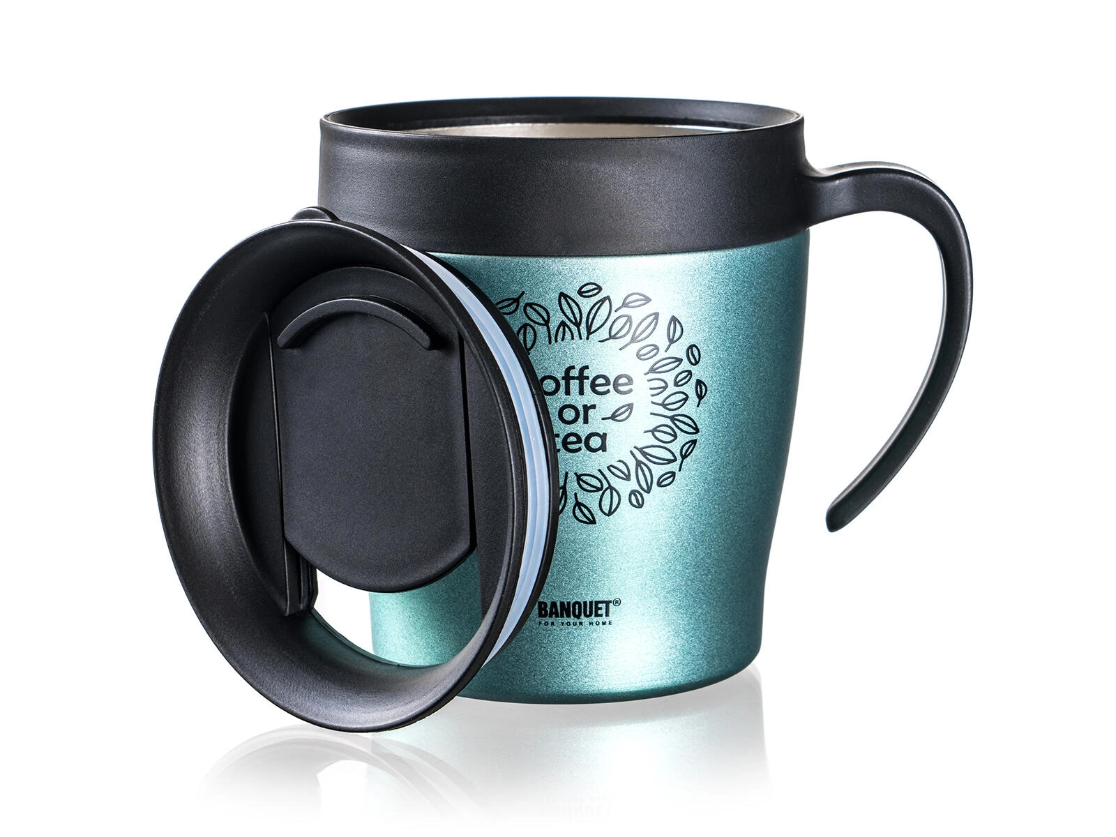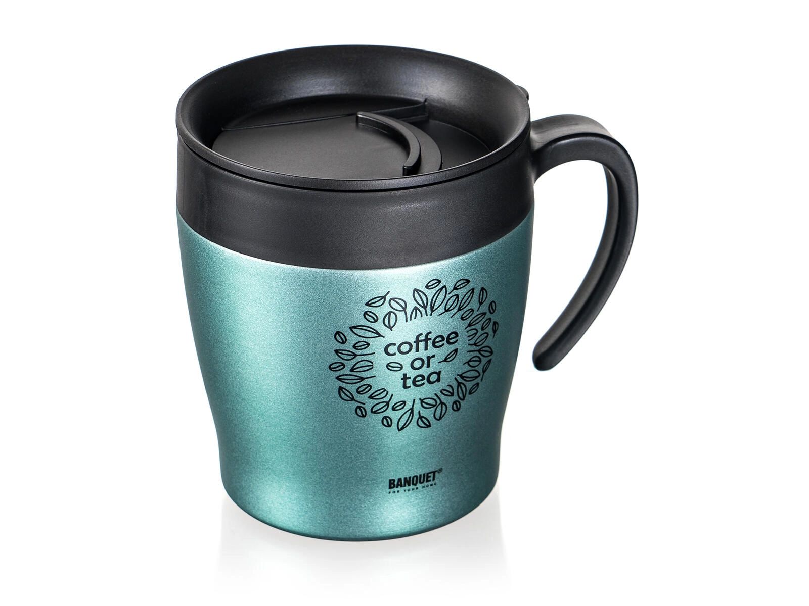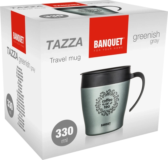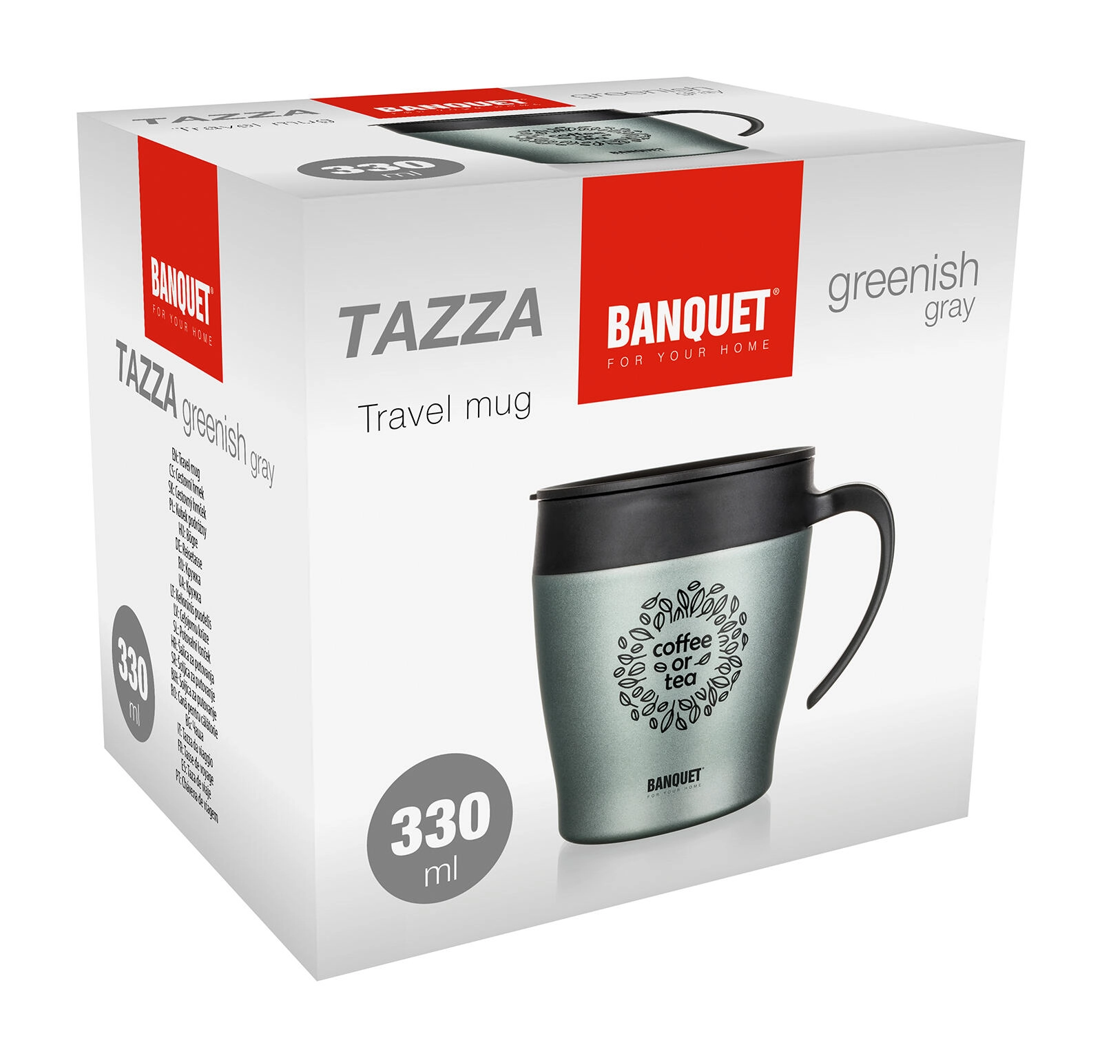 Stilfuldt dobbeltvægget rejsetermokrus 330 ml BANQUET Tazza i grøn-grå metallak holder dine drikke varme eller kolde i længere tid. Det har et rustfrit stålhus med vakuumisolering, et behageligt låg til at drikke af og er ideelt til kaffe eller te på farten.