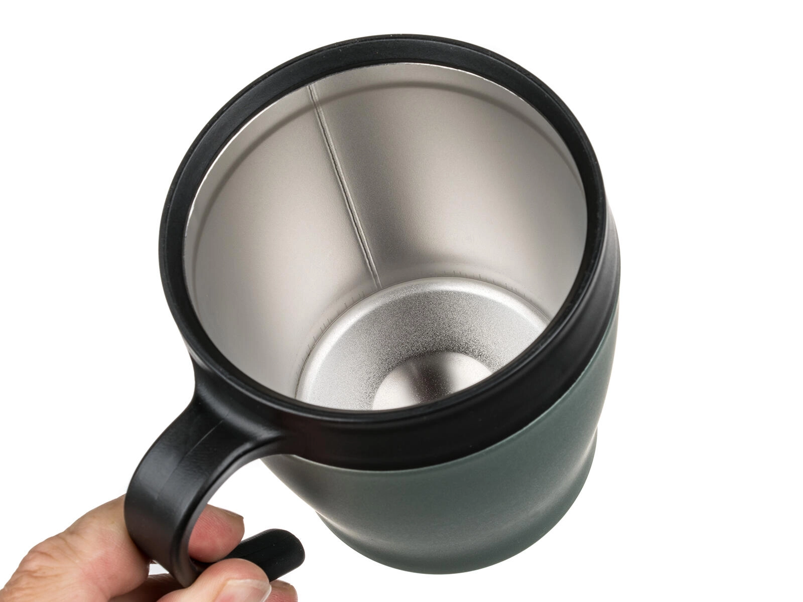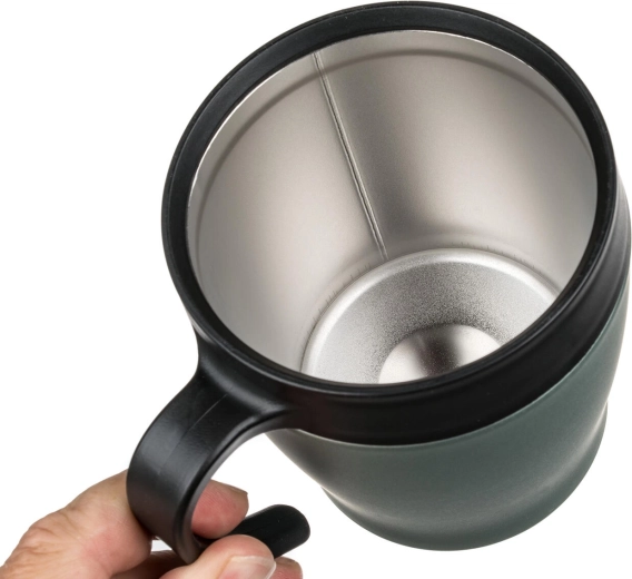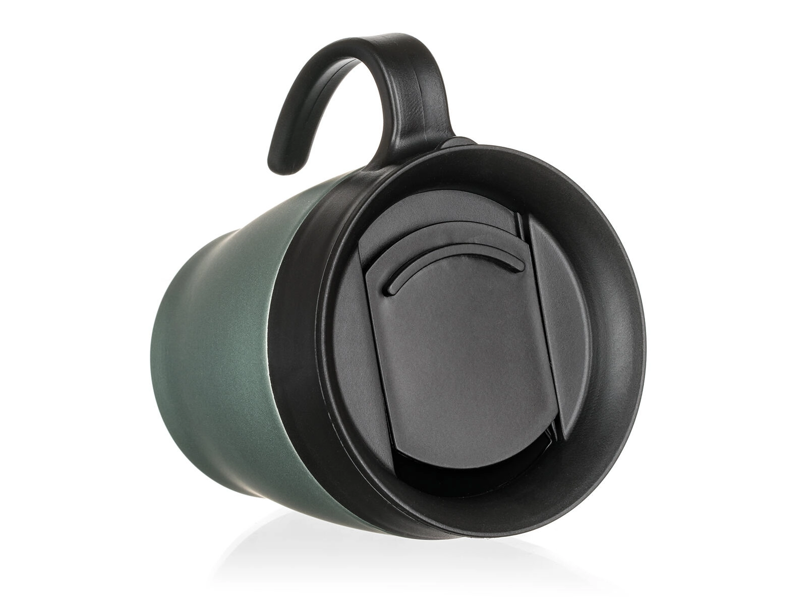 Det praktiske låg muliggør komfortabelt at drikke på farten. Låget er ikke helt lækagesikkert – for sikker brug anbefaler vi at opbevare det i lodret position. Den elegante grøn-grå metalliske finish giver din daglige rutine stil.