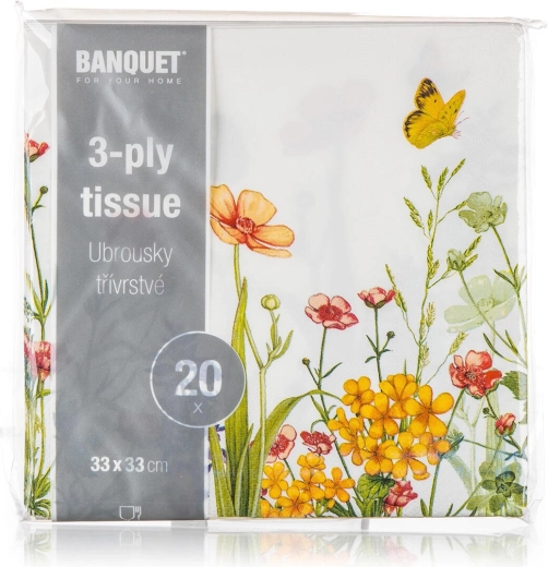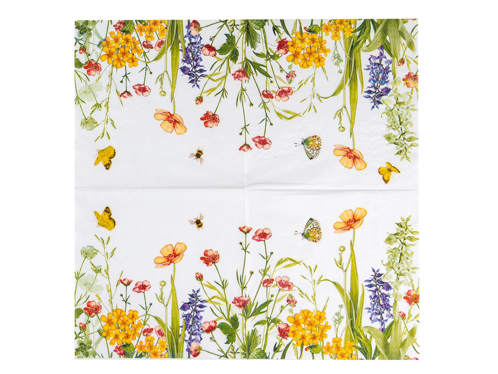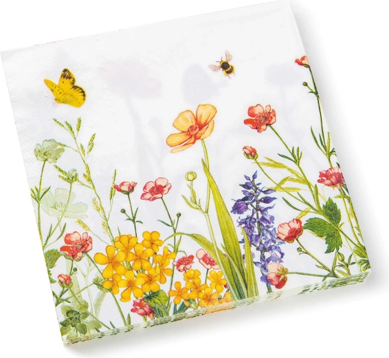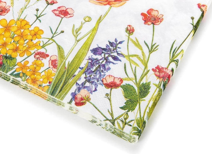 Den universelle størrelse på 33 × 33 cm passer i servietstativer og til kreativ borddekoration. Det trykte motiv af en blomstrende eng i blide farver matcher flot med forårs-, sommer- og landlig udsmykning og pifter fødselsdagsfester, grillarrangementer og familiemiddage op.