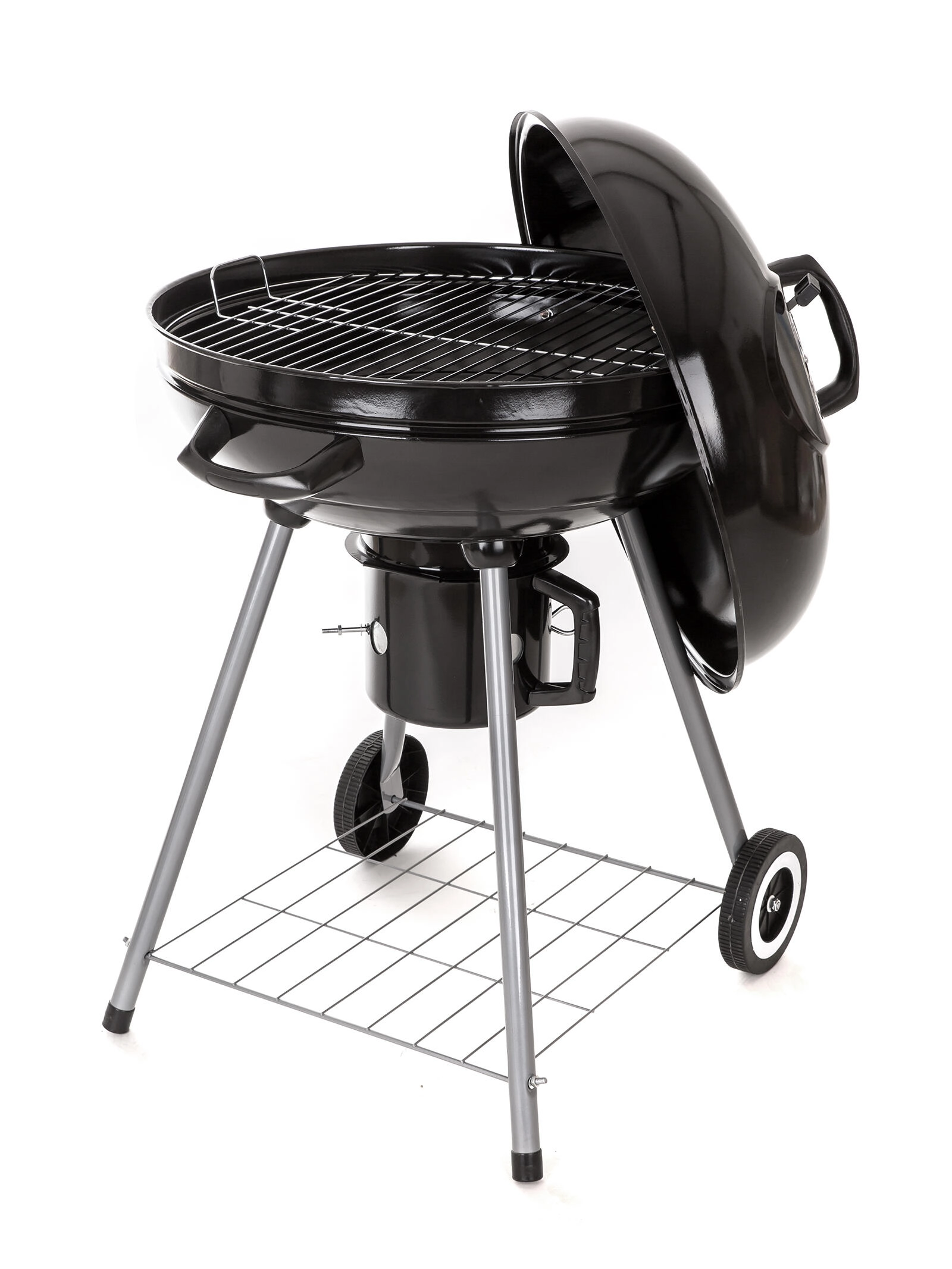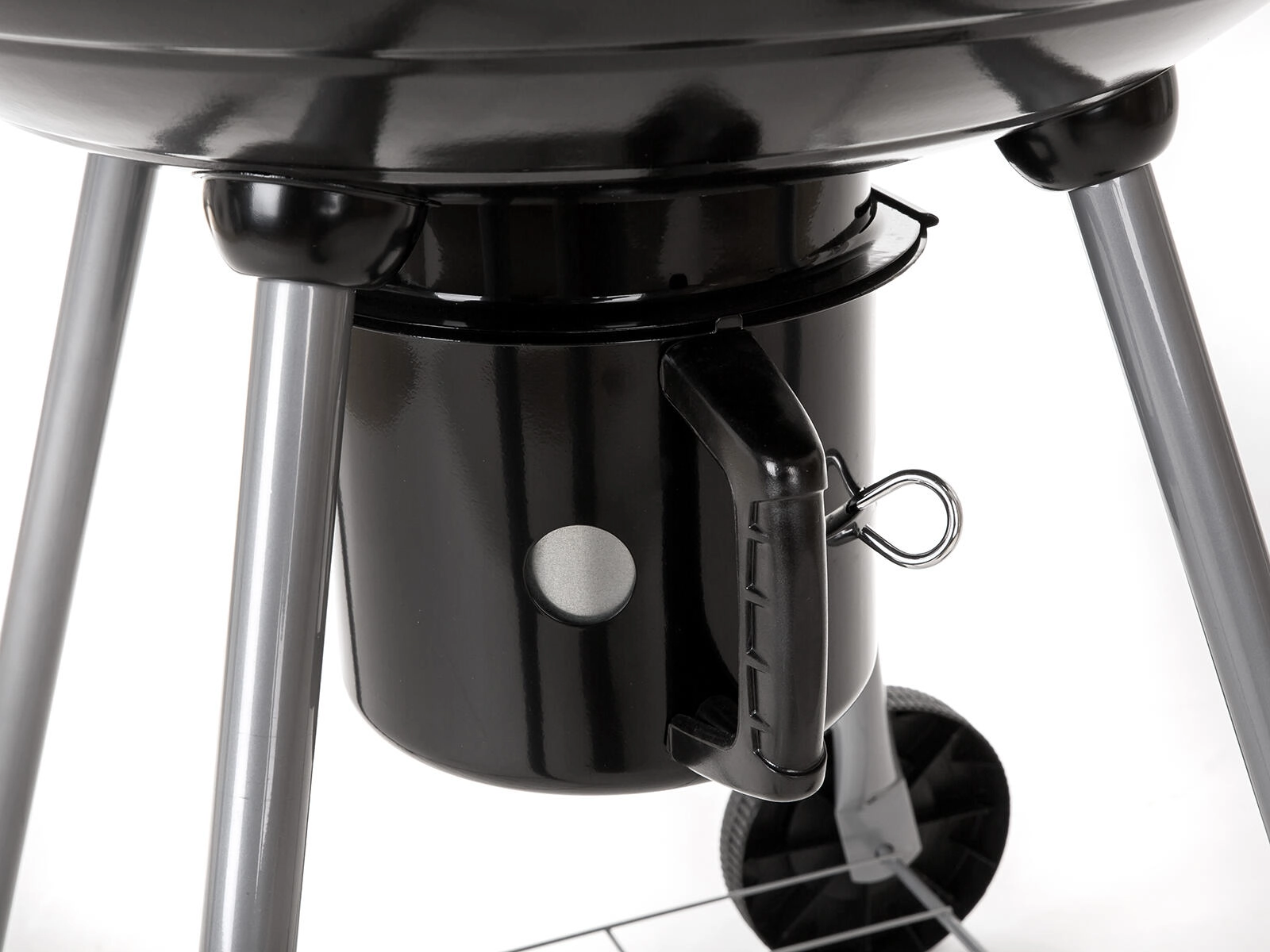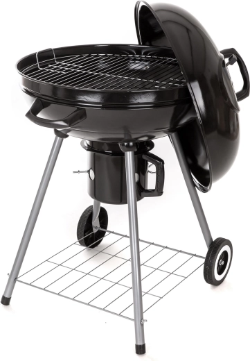 Den praktiske aftagelige askebeholder gør rengøringen hurtigere, og hjulene muliggør bekvem flytning af grillen på terrasse eller i have. Den stabile konstruktion med ben i rustfrit stål og en galvaniseret kulrist garanterer holdbarhed og sikker drift.