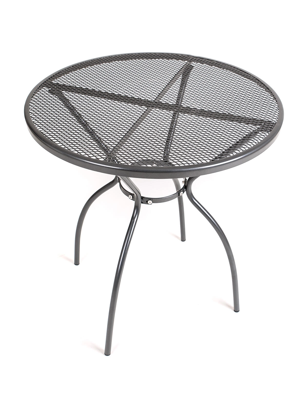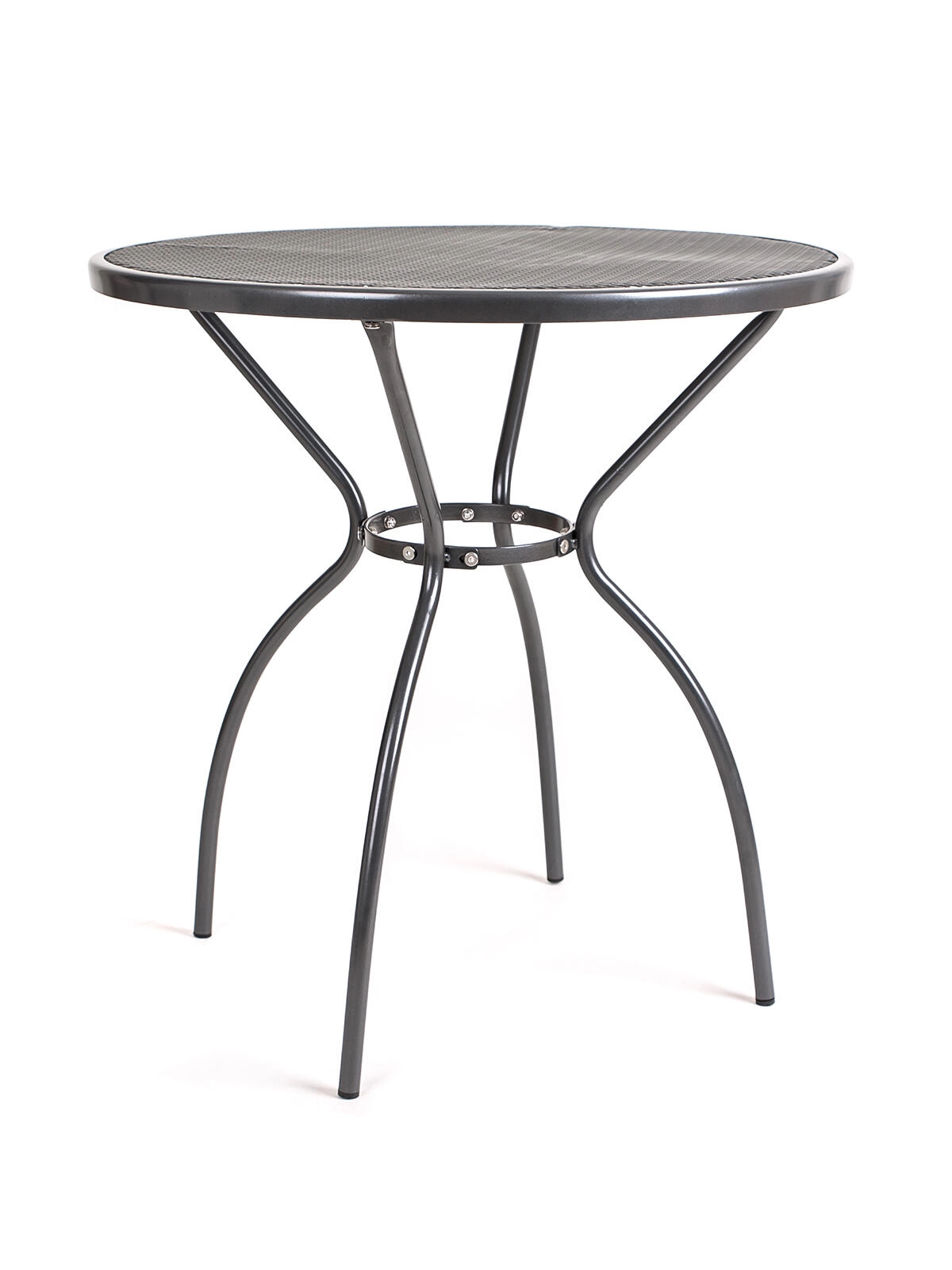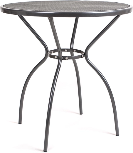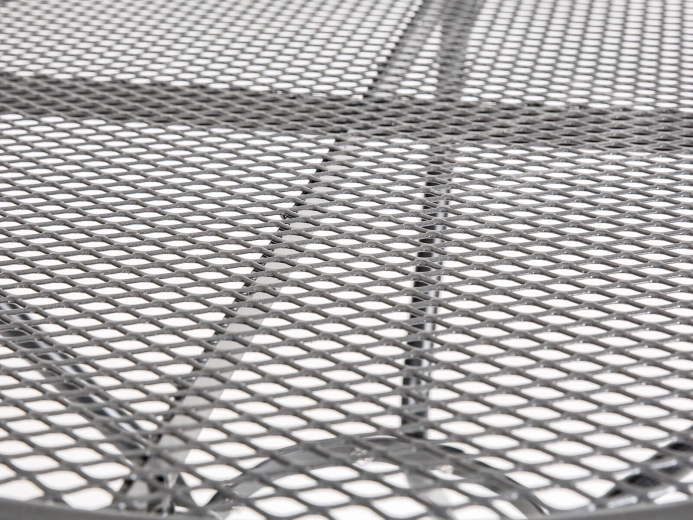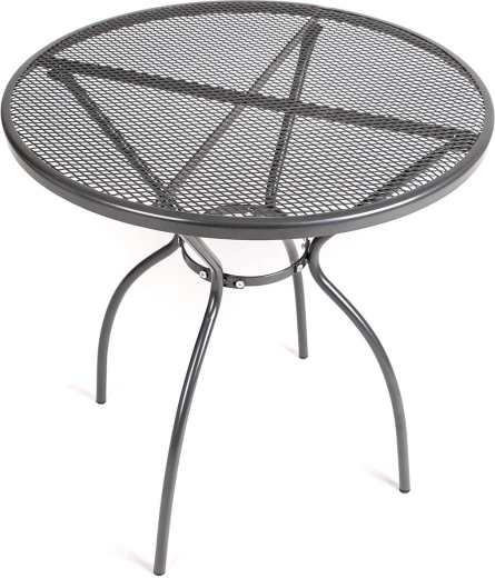 Den perforerede (net) bordplade muliggør hurtig vandafledning og nem rengøring, mens de solide rørben med bundkapper hjælper med at beskytte underlag og øger stabiliteten. Bordet egner sig som bistrobord, sidebord eller et mindre spisebord til udendørs hygge.