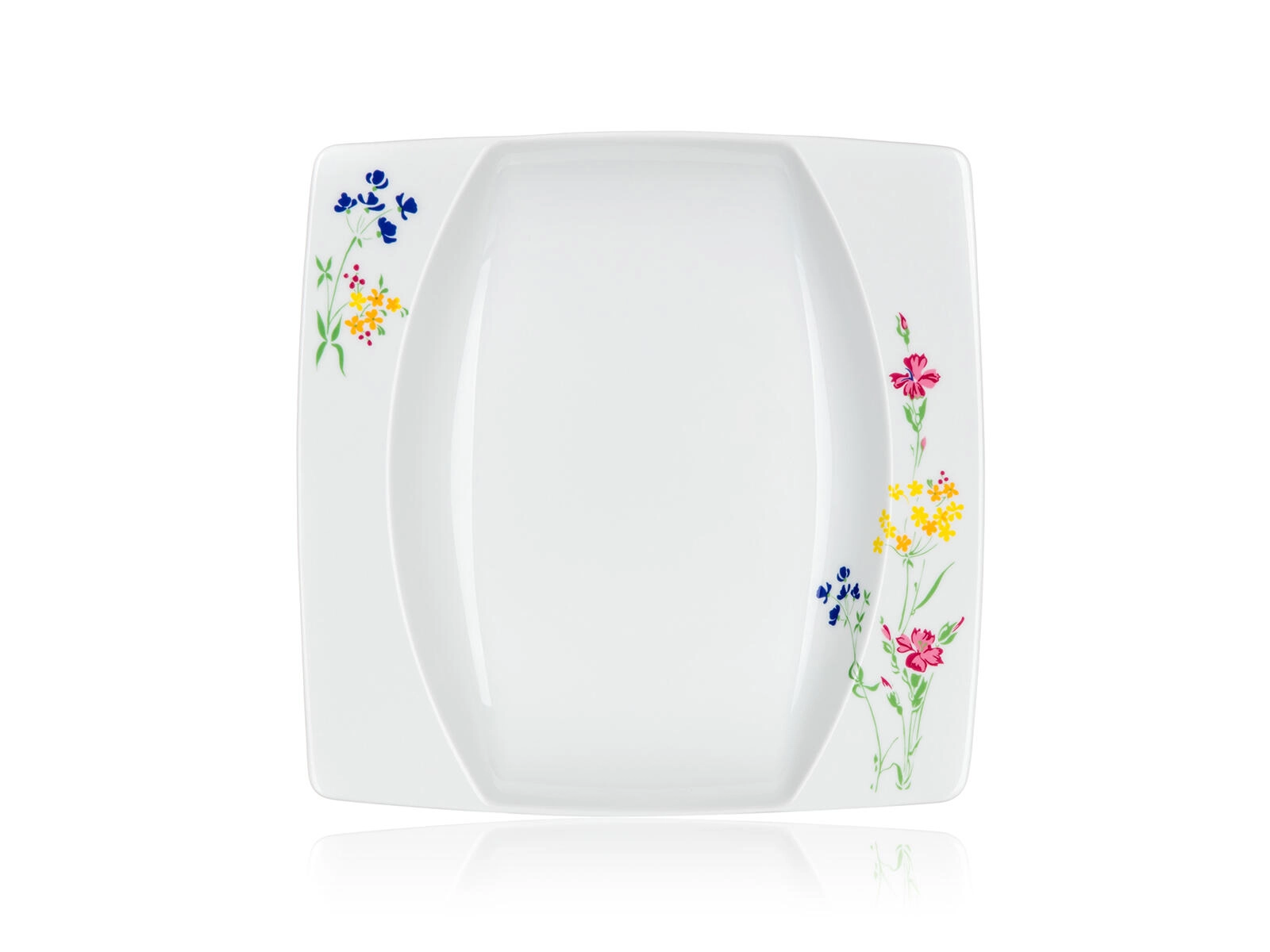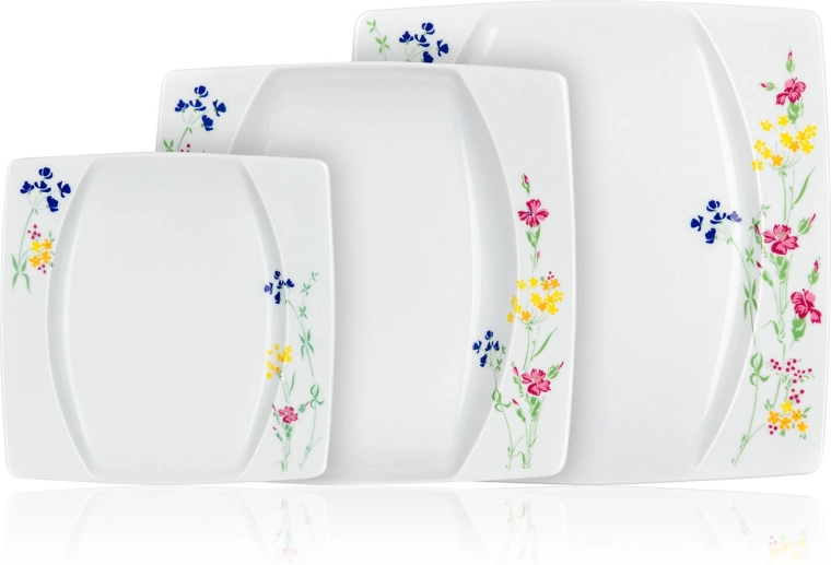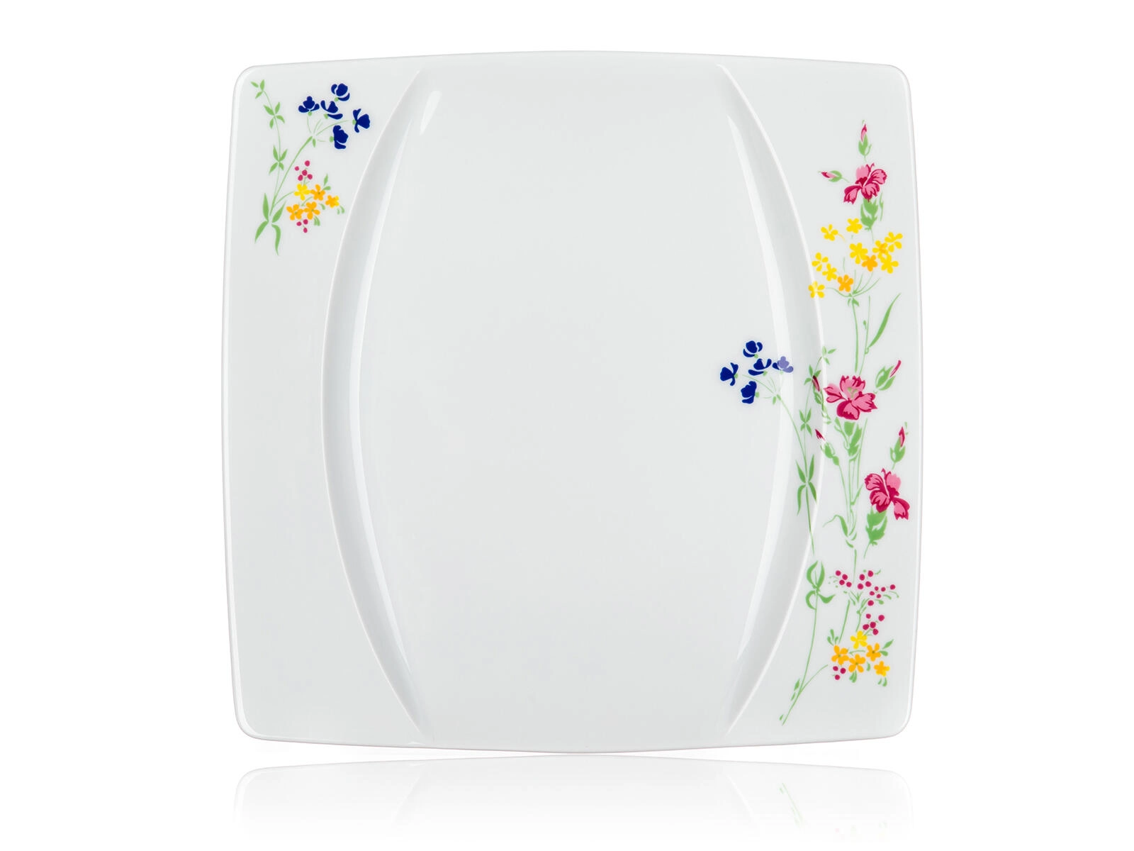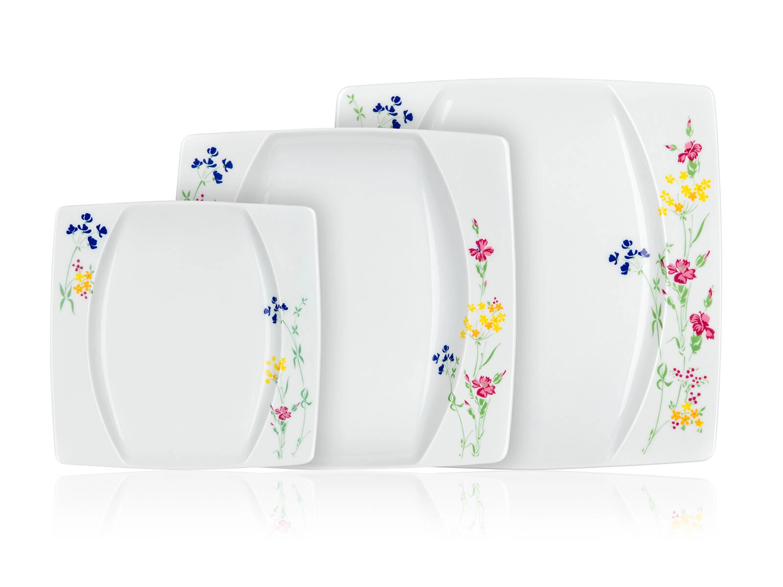 Dette tidløse firkantede sæt kombinerer elegant design med praktisk anvendelse i hverdagen. Det fine blomstermotiv på kanterne og den blanke glasur understreger både festlig og daglig opdækning. Takket være det robuste THUN‑porcelæn er tallerkenerne nemme at vedligeholde og bevarer farver og glans i lang tid.