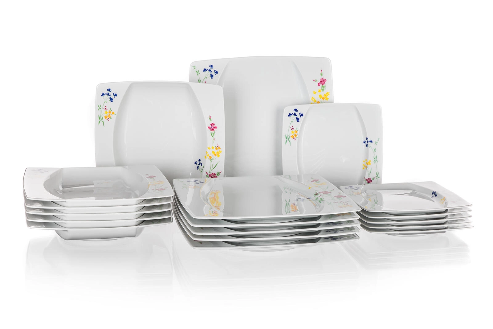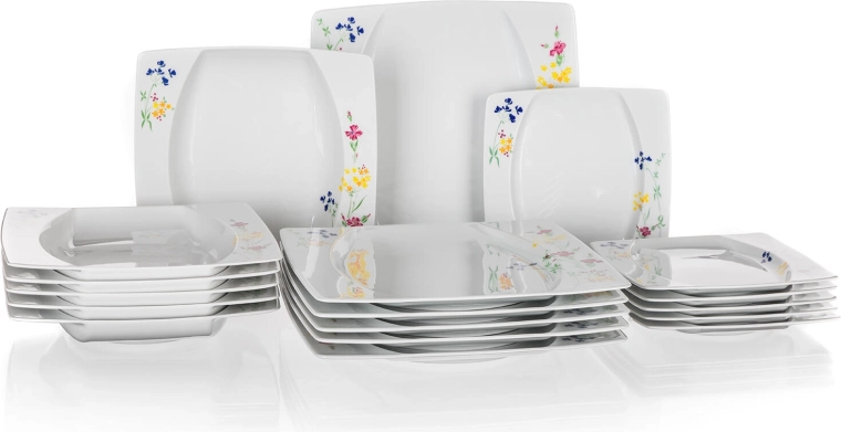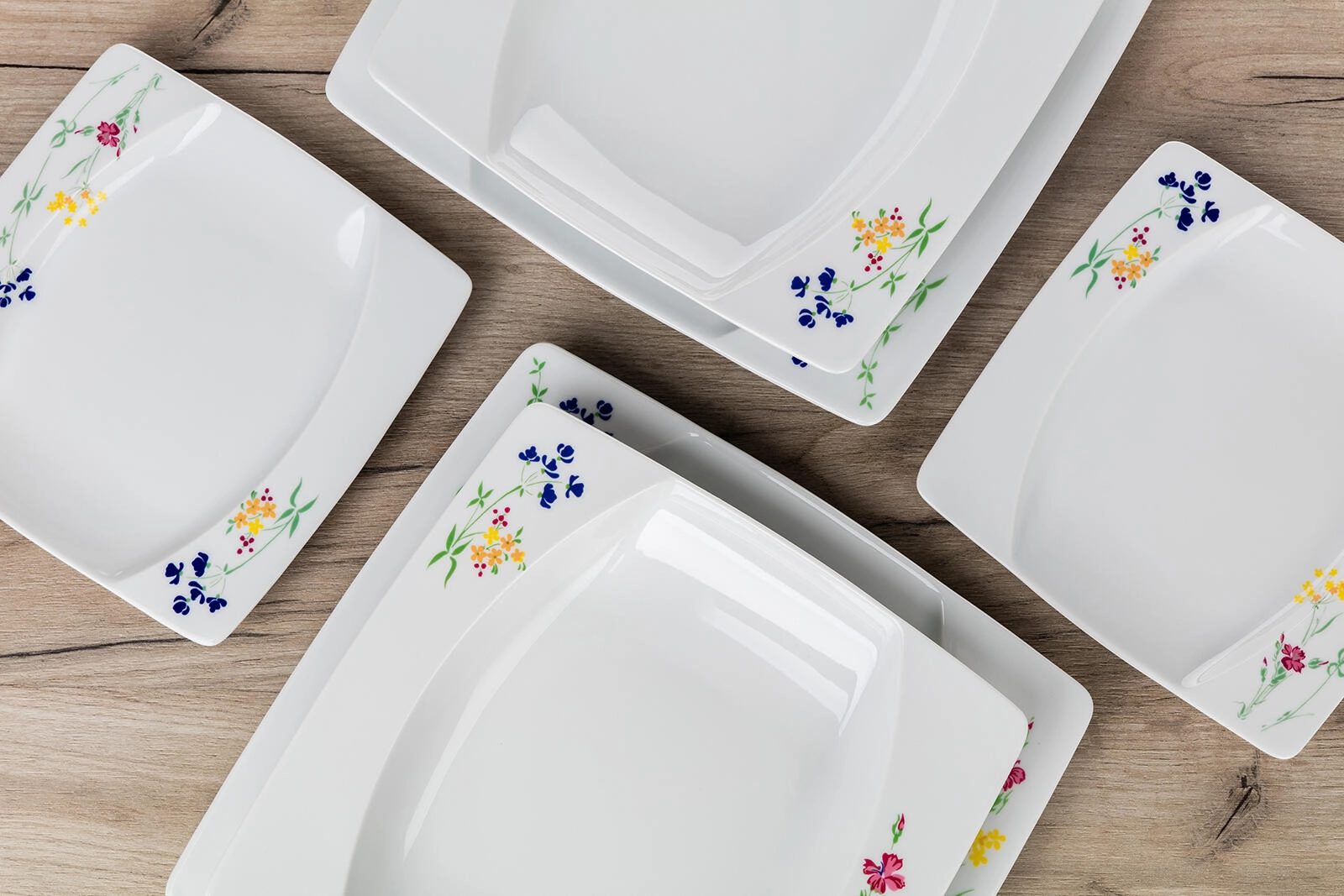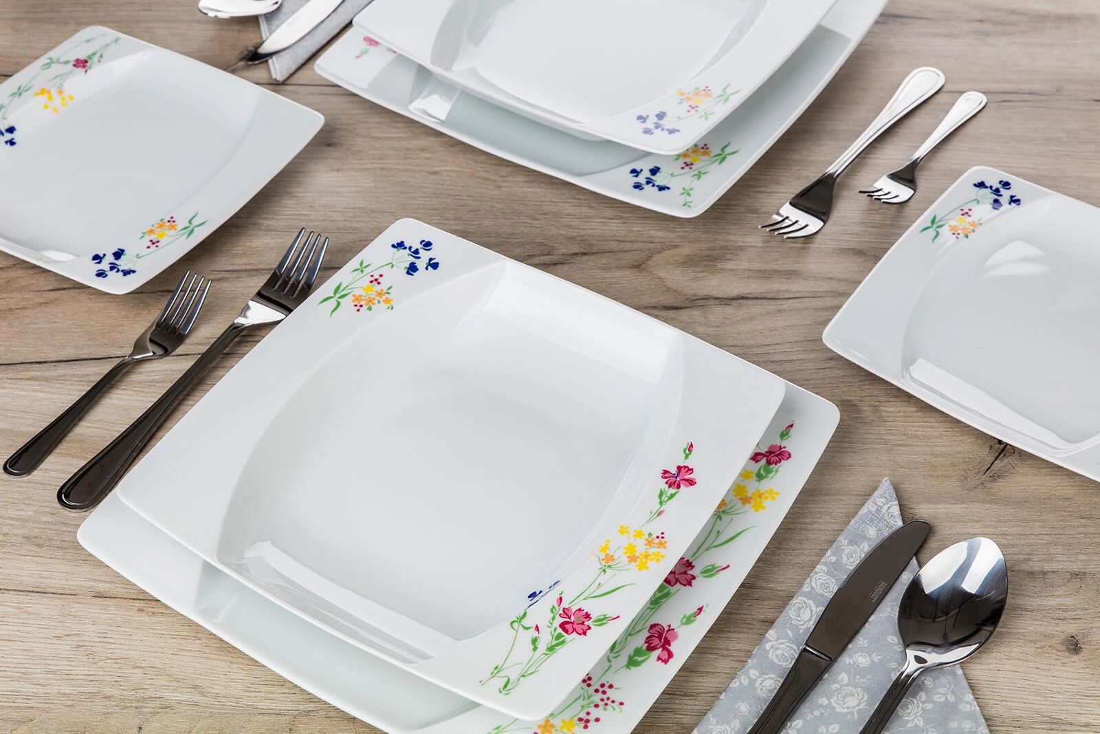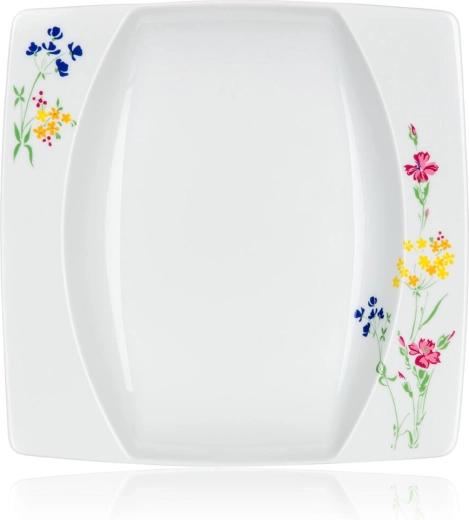 Dette tidløse firkantede sæt kombinerer elegant design med praktisk anvendelse i hverdagen. Det fine blomstermotiv på kanterne og den blanke glasur understreger både festlig og daglig opdækning. Takket være det robuste THUN‑porcelæn er tallerkenerne nemme at vedligeholde og bevarer farver og glans i lang tid.