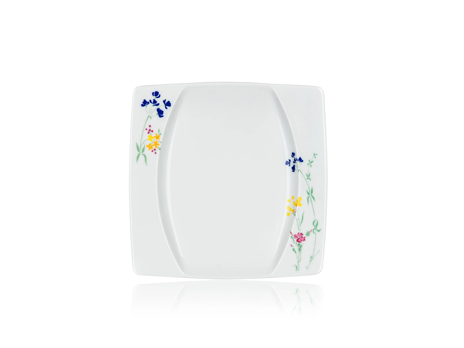 Stilfulde firkantede tallerkener med et fint blomsterprint i hjørnerne giver opdækningen et personligt præg og er nemme at kombinere med andet service.