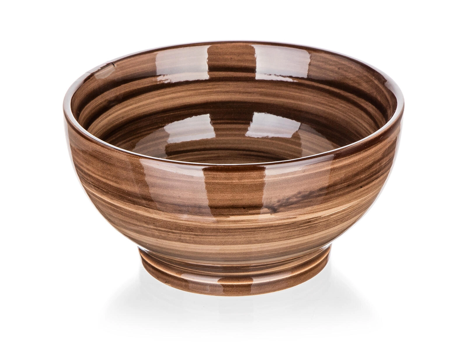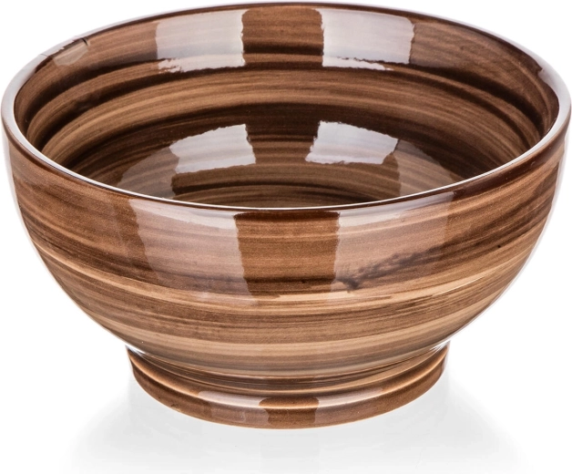 Stilfuld keramisk skål PALAS med en diameter på 14,3 cm og en kapacitet på 610 ml er ideel til morgenmad, supper og snacks. Takket være den holdbare glasur er den nem at rengøre og egnet til opvaskemaskine og mikrobølgeovn. Det elegante brune stribede design giver din borddækning et naturligt præg.