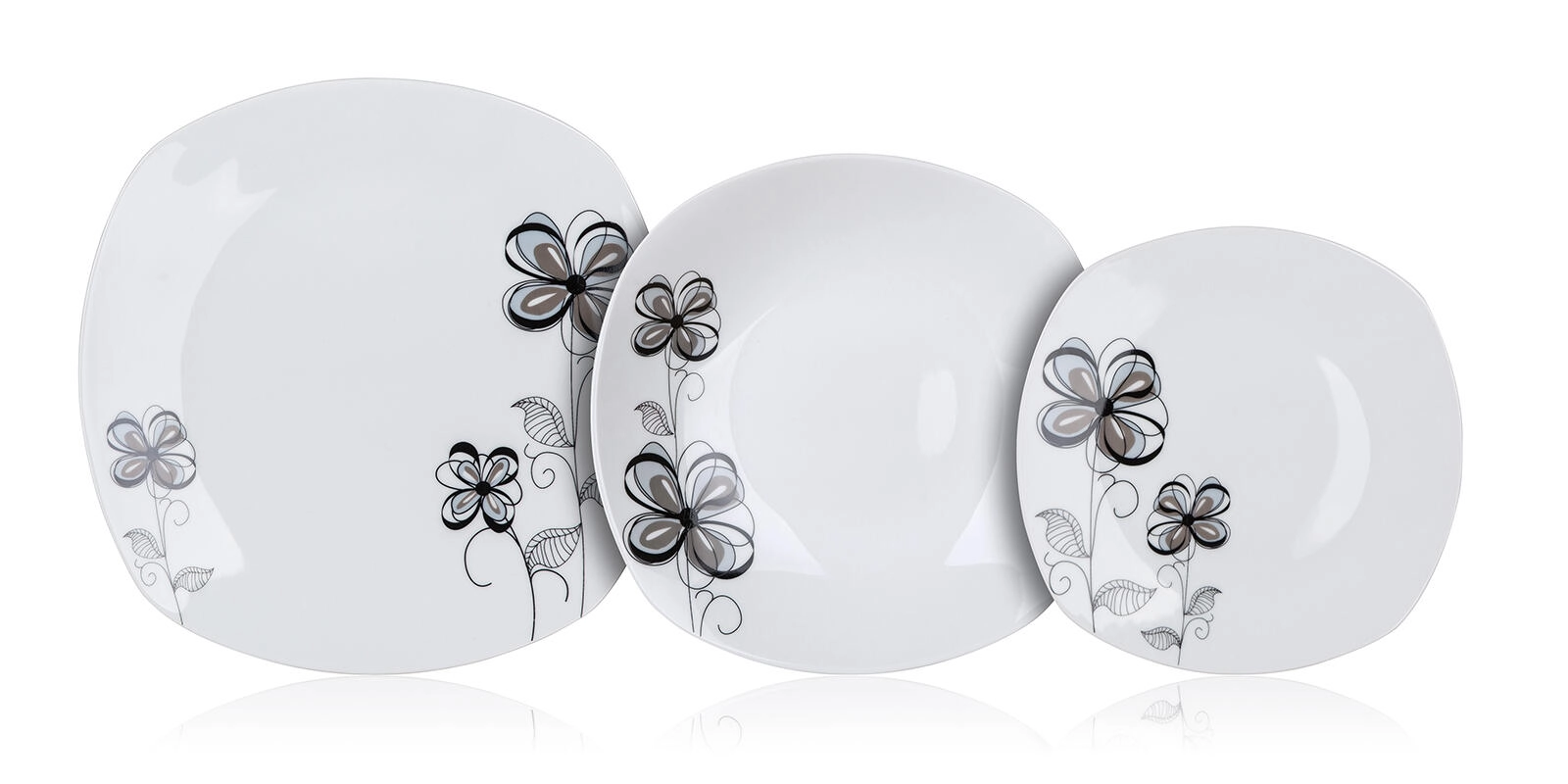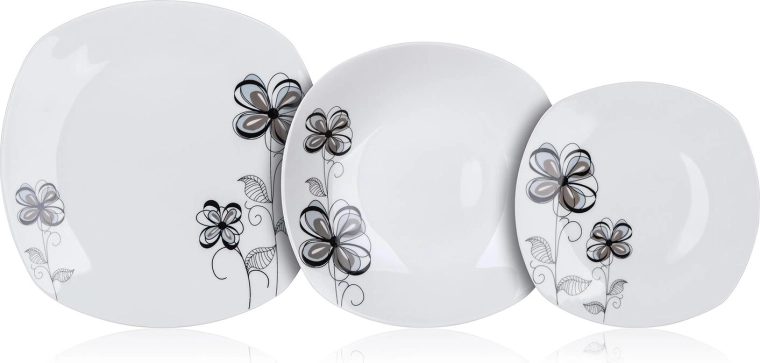 Spisestellet FLOREA Square i kvalitetsporcelæn udmærker sig ved sin moderne form med afrundede hjørner og et diskret sort-gråt blomsterdekor. Det er ideelt til servering af supper, hovedretter og desserter og kan nemt matches med andet service på dit bord.