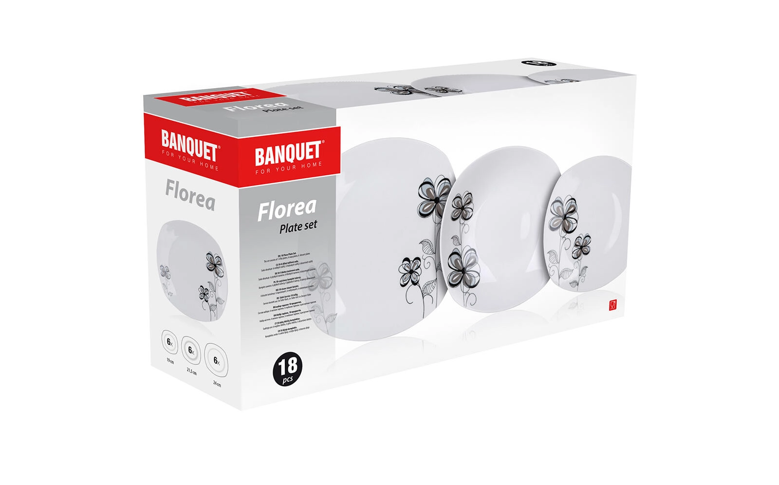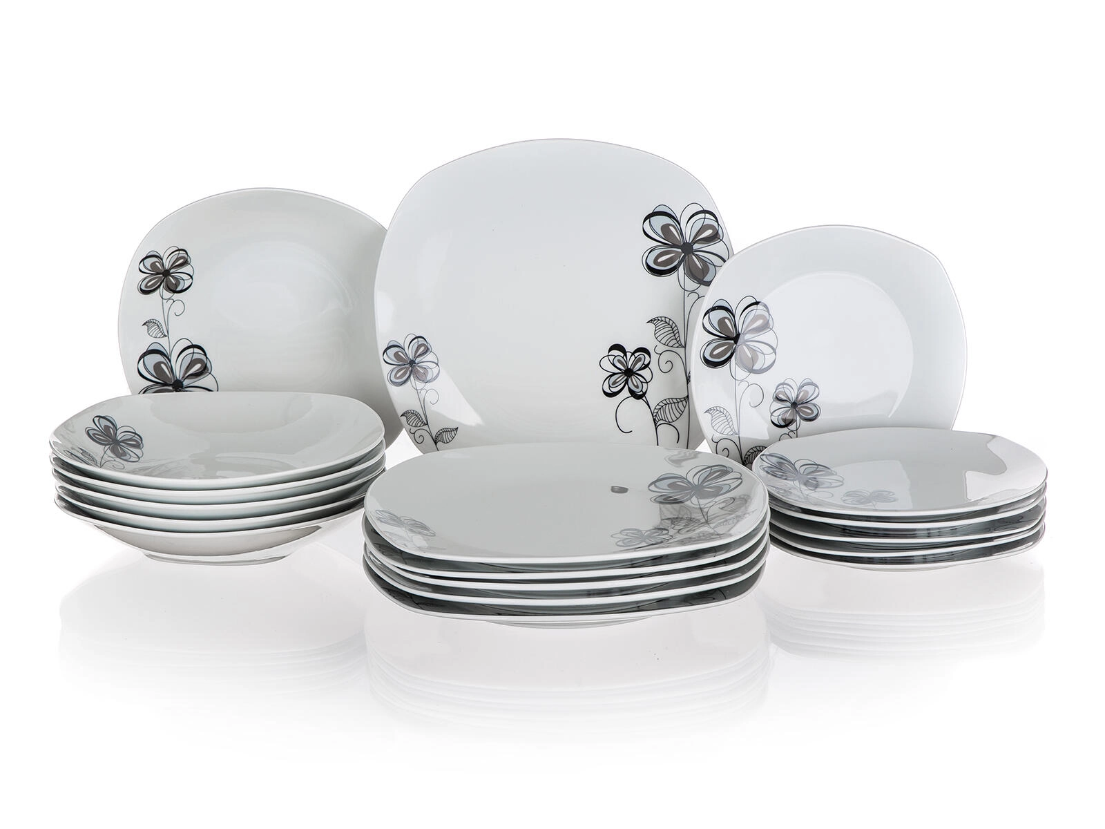 Elegant porcelænsservicesæt FLOREA Square i hvid med moderne design og blomstermotiv til både hverdag og fest. Sættet indeholder 18 dele til 6 personer og tilbyder dybe, flade og desserttallerkener med en afrundet rektangulær form. Alle dele er egnede til opvaskemaskine og mikrobølgeovn.