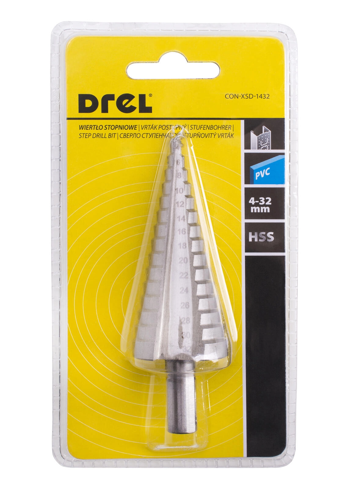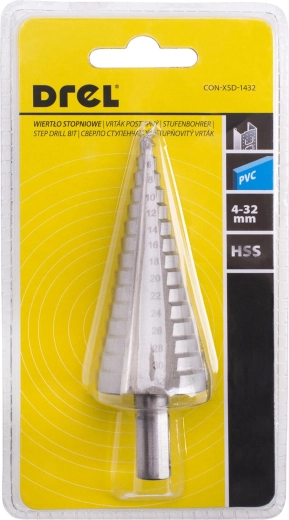 Universelt trinbor af HSS-hurtigstål med område 4–32 mm og 15 præcise trin til ren boring uden forboring. Ideelt til tyndvæggede plader, ikke-jernholdige metaller og plast, sikrer glatte huller uden grater og uden fastsiddende spåner.