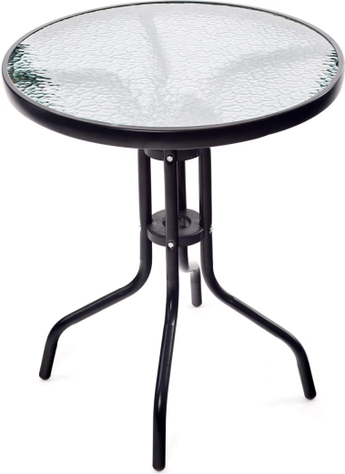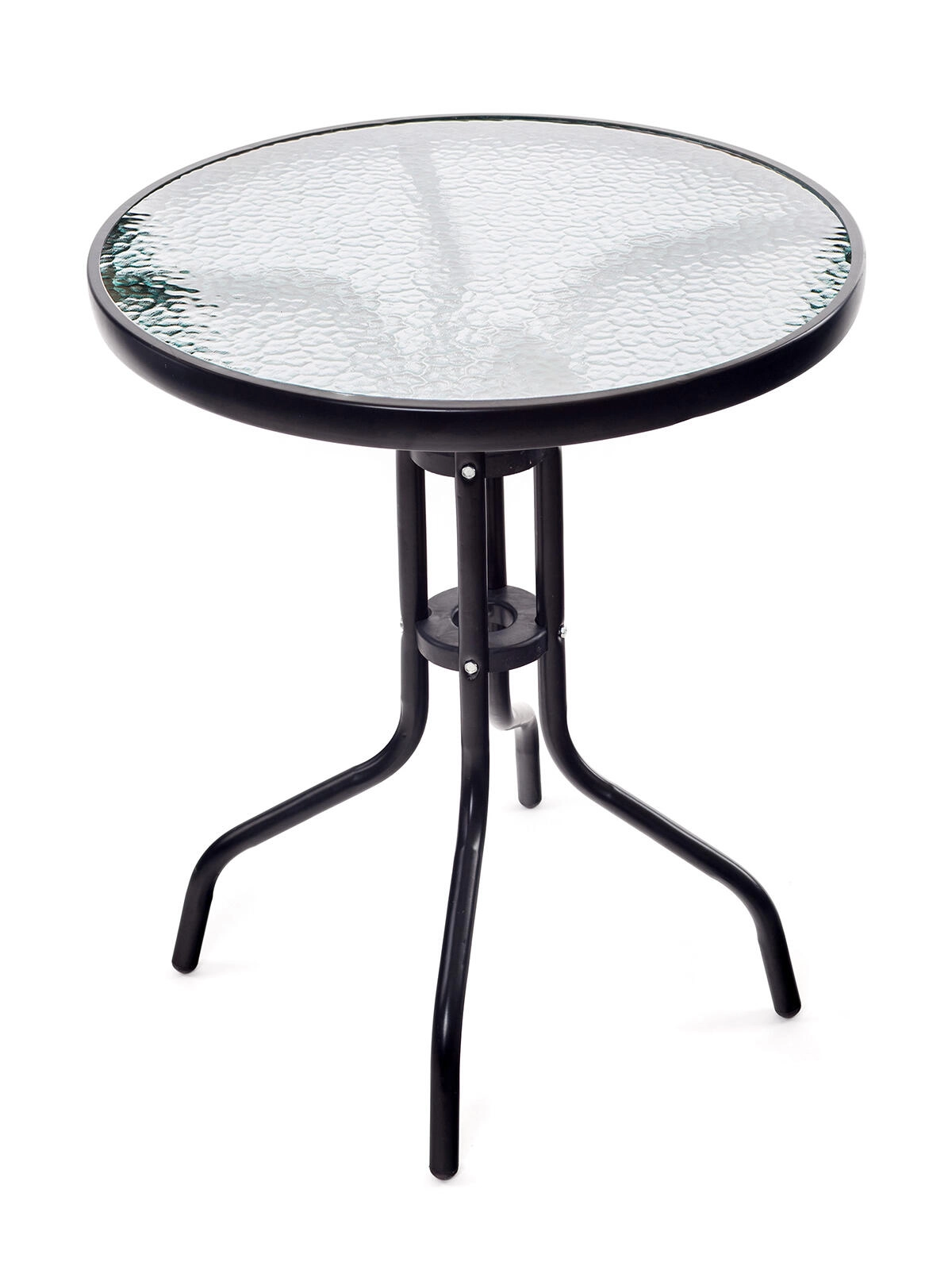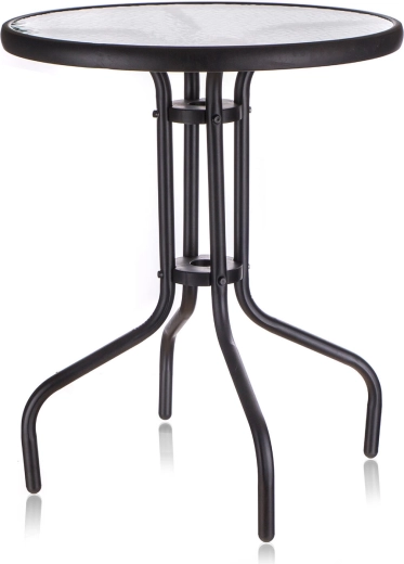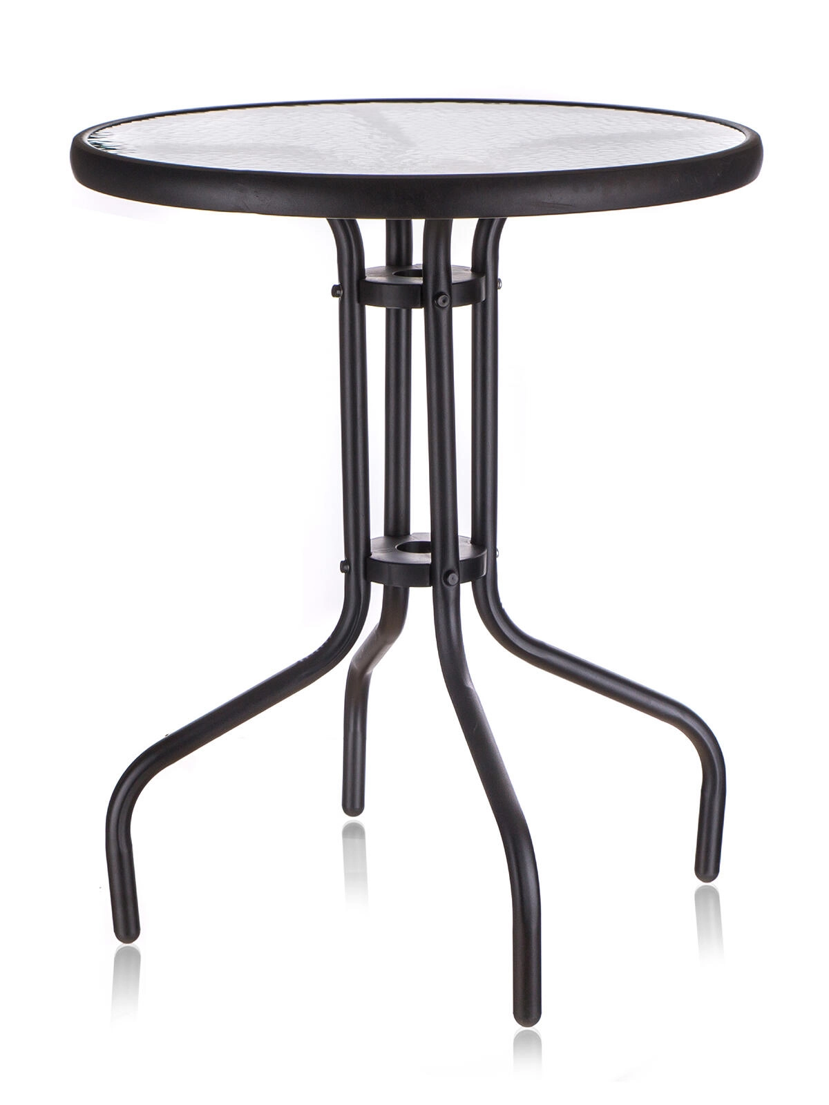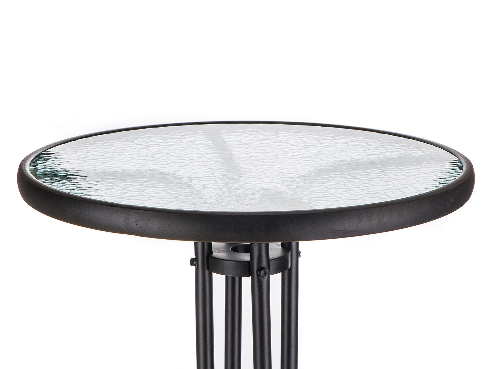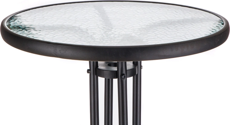Det stilfulde runde bord i sort er et ideelt valg til mindre udendørsområder. Takket være de kompakte mål fungerer det perfekt som sidebord til siddepladsen, til kaffe, bøger eller blomster. Metalkonstruktionen virker stabil, mens den teksturerede glasplade er let at rengøre og tåler daglig brug.