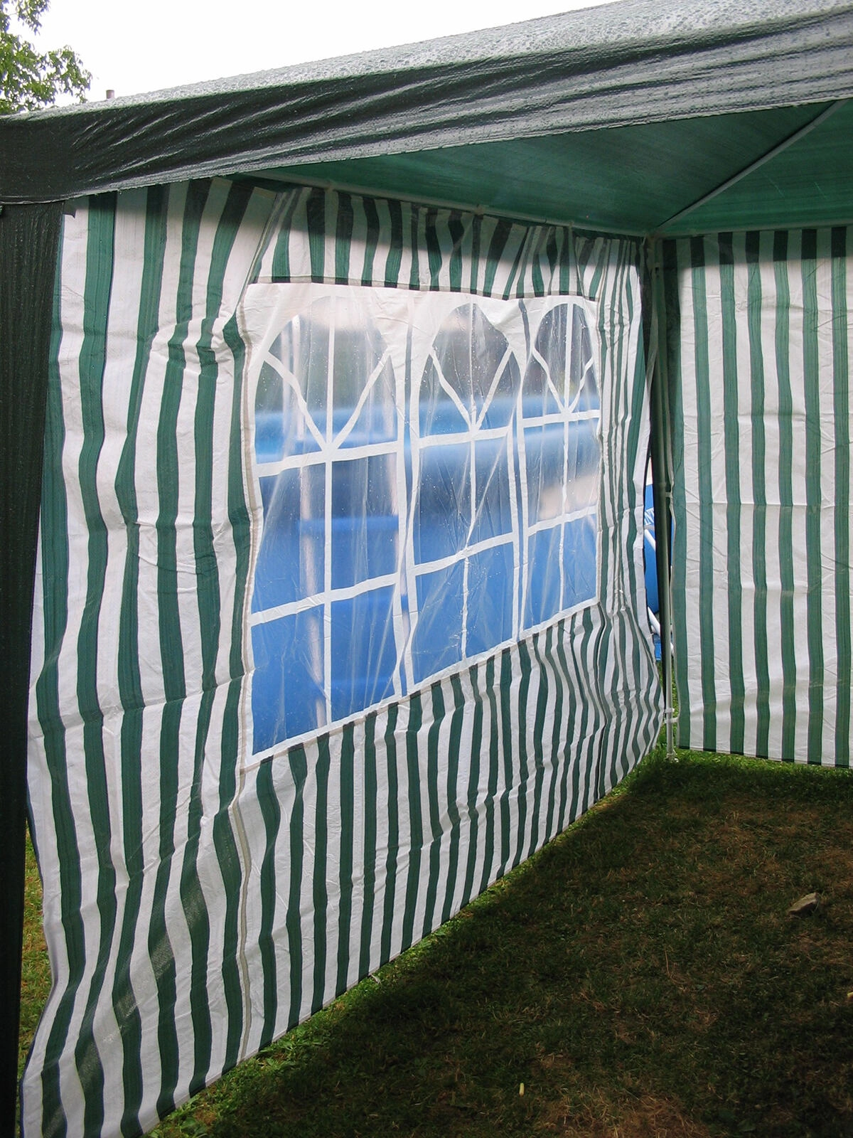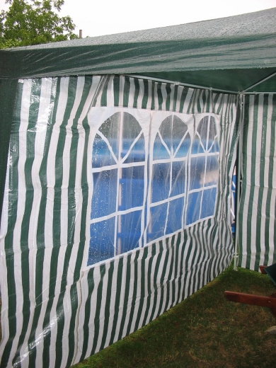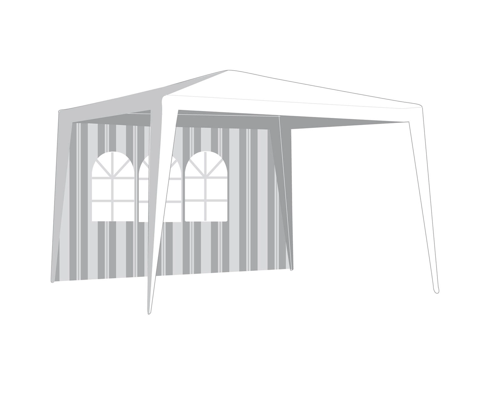 Praktisk sidevæg til havepavilloner og partytelte i størrelsen 295 × 190 cm med tre vinduer af transparent PVC. Det slidstærke PE‑materiale 100 g/m² beskytter mod vind og let regn, mens vinduerne lukker rigeligt dagslys ind. Ideelt tilbehør til 3 × 3 m pavilloner i et elegant design med hvid‑grønne striber.