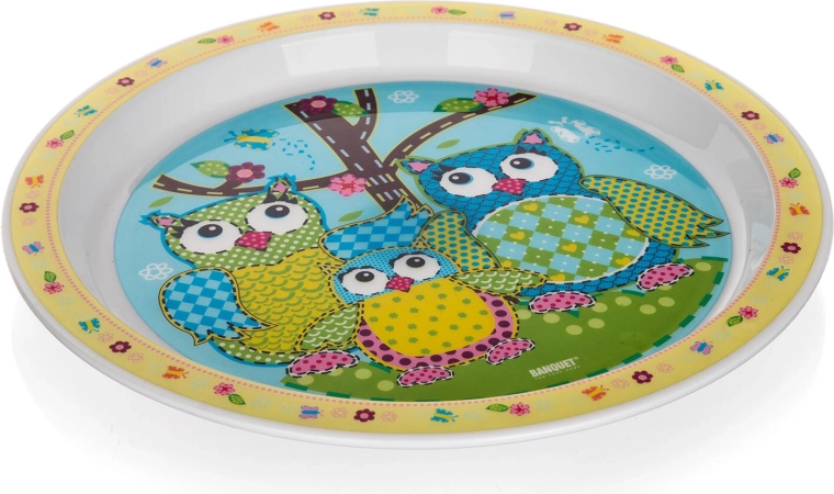 Sød børnetallerken med uglemotiv, diameter 21 cm, fremstillet af kvalitetsplast til daglig brug. Tilbyder nem rengøring, er en let og sikker løsning til børn og fremmer spiseglæde med sit legende design. Ikke egnet til mikrobølgeovn eller opvaskemaskine.
