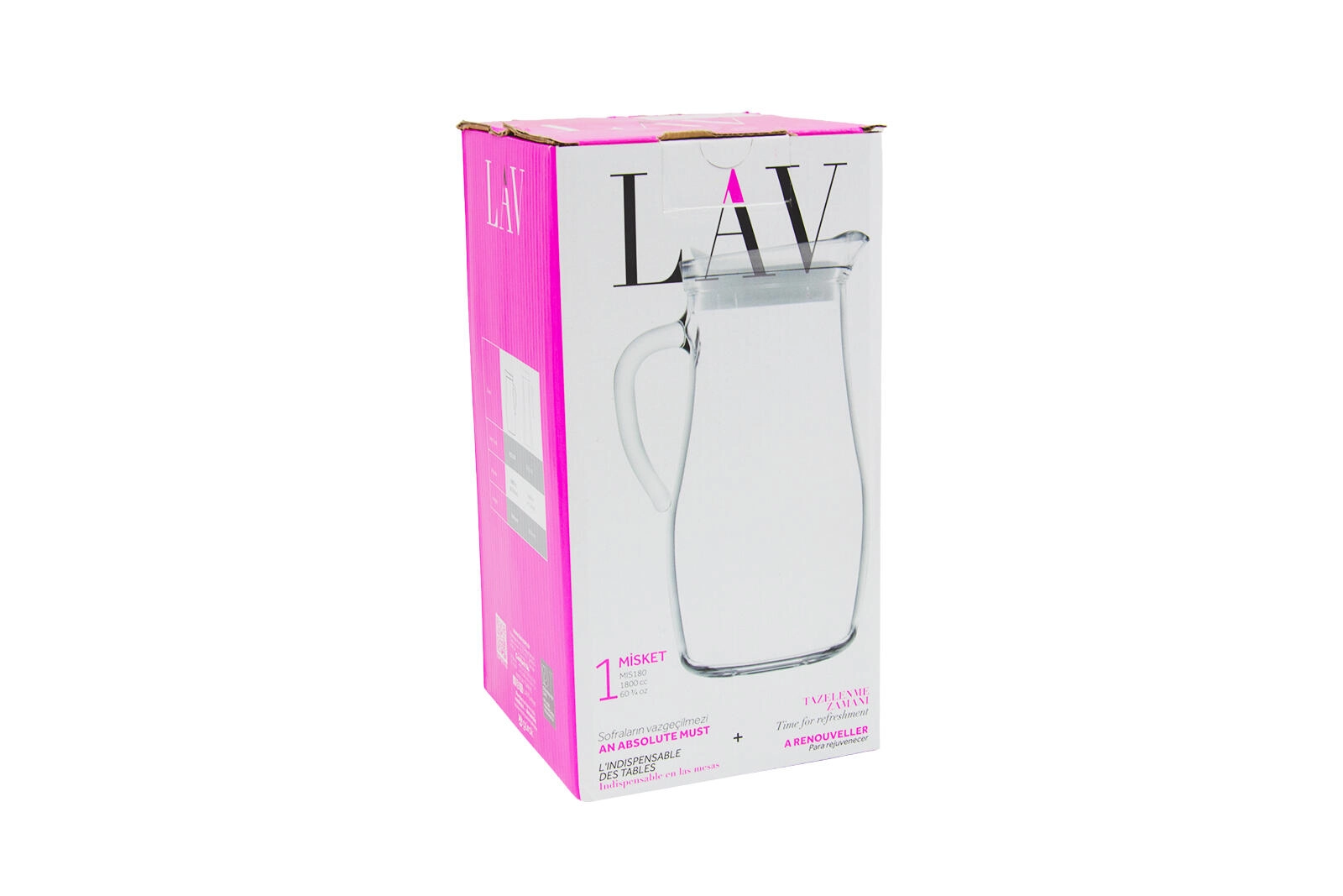 Den praktiske glaskande MISKET i tidløst design er et fremragende valg til daglig brug og festlig servering af drikke. Takket være den brede åbning er den let at fylde og rengøre, og de formede hældetude muliggør jævn ophældning uden at dryppe. Plastlåget beskytter drikkene mod urenheder og holder dem friske længere.