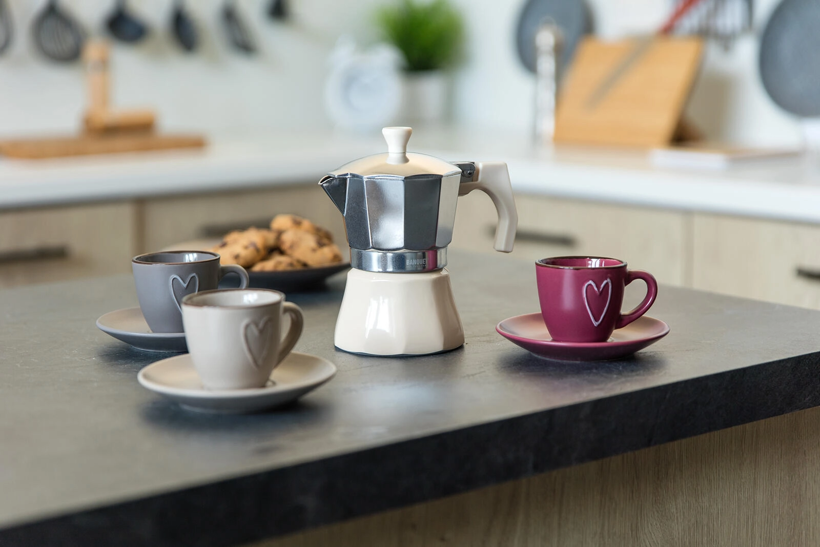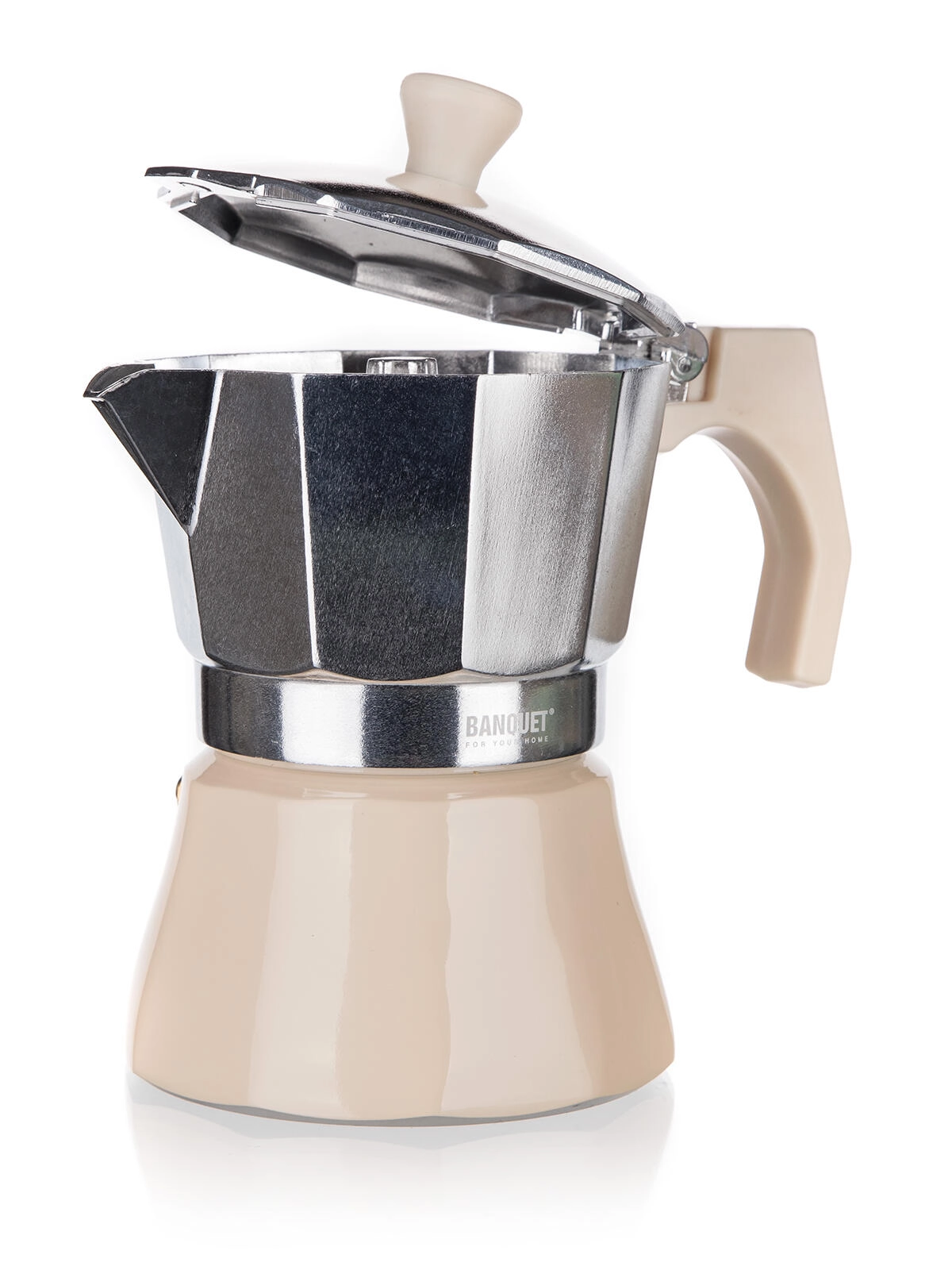 Den traditionelle moka-kande CAMPI til 6 kopper brygger stærk, aromatisk kaffe direkte på komfuret. Robust aluminiumskrop med sikkerhedsventil, nem servering og tidløst elfenbensfarvet design. Velegnet til gas-, el- og glaskeramiske kogeplader.