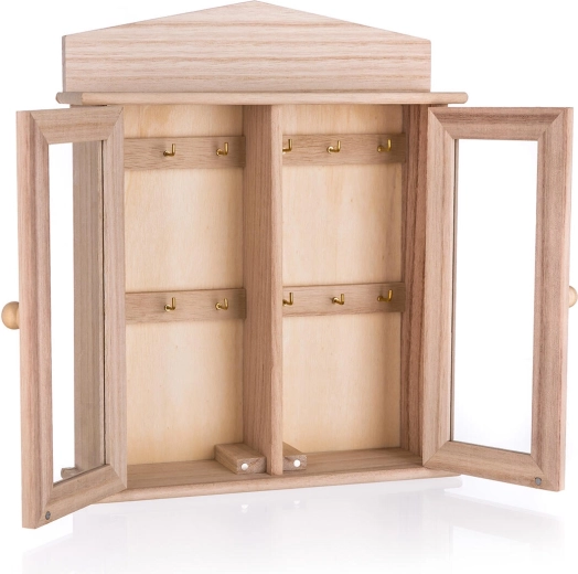 Stilfuldt træ-nøgleskab med glaslåger holder dine nøgler overskueligt samlet ét sted. De kompakte mål 27 × 22 × 6,5 cm og det kvalitetsrige materiale af birketræ og grantræ sikrer holdbarhed og et elegant udtryk.