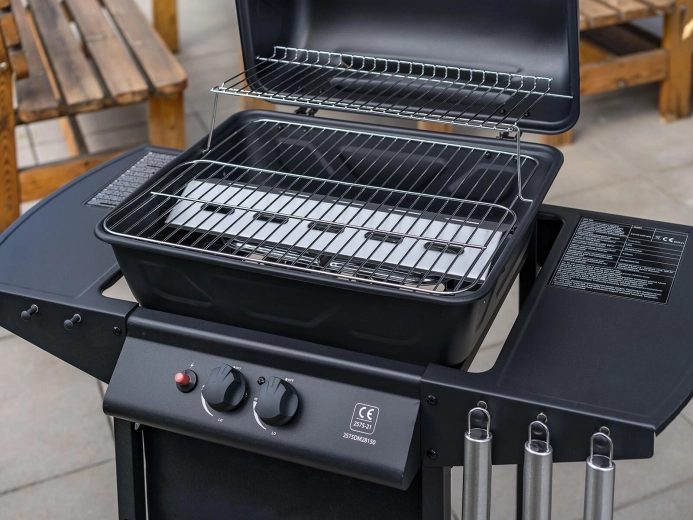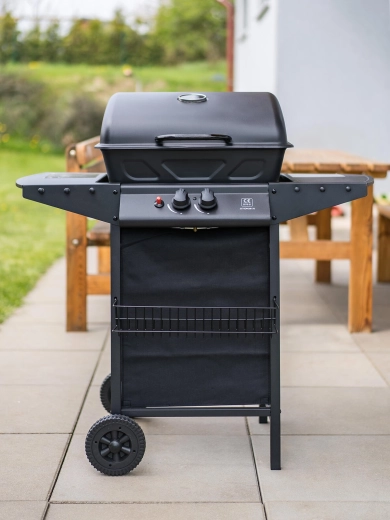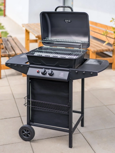 Elegant og meget praktisk gasgrill Kimberley med to brændere tilbyder bekvem grillning med jævn gennemstegning takket være låg med termometer. Den har en opvarmningsrist til at holde færdige retter varme eller lune brød, to aflægningsflader med kroge til udstyr og piezo-tænding for en hurtig start. Takket være hjulene kan du nemt flytte den til terrassen eller haven.