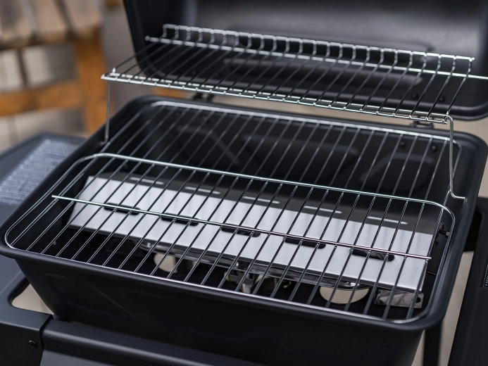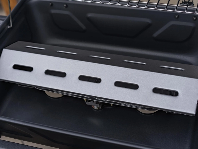 Den praktiske opvarmningsrist holder færdige retter varme eller hjælper med at lune brød. To sideaflægningsflader med tre kroge til udstyr og en frontkurv giver rigelig plads til marinader og redskaber. Takket være to hjul kan grillen nemt flyttes til det ideelle sted. Du kan grille med låg eller uden efter behov.