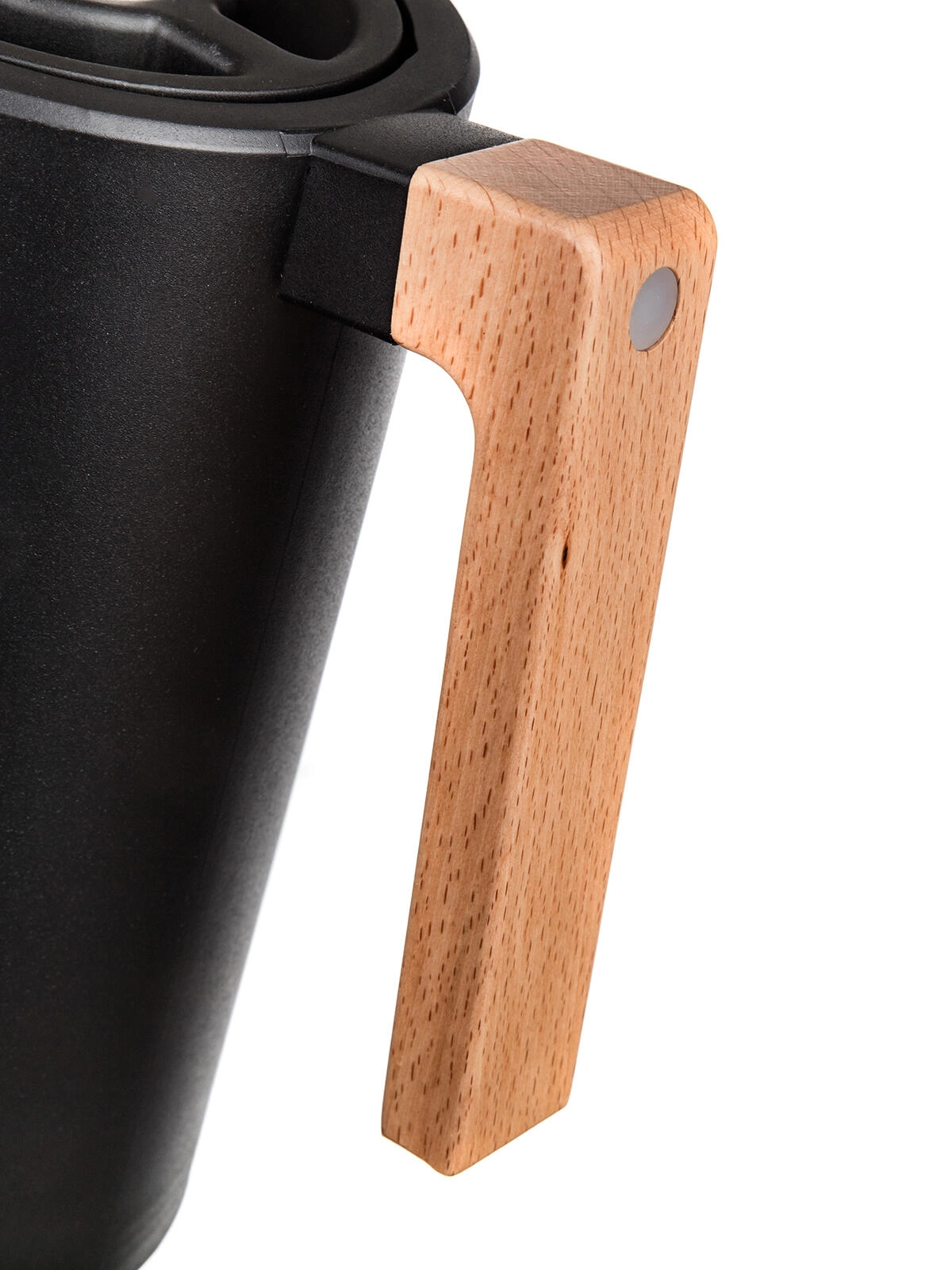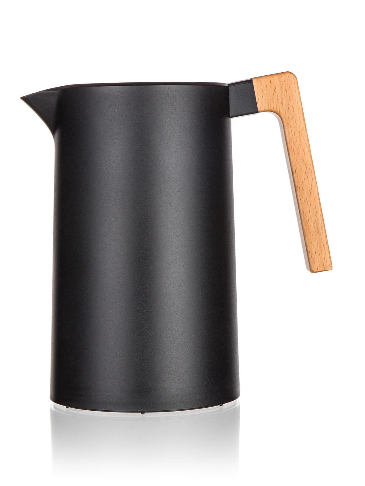 Termokanden Joyce kombinerer moderne design i sort med funktionalitet til hverdagsbrug. Dobbeltvægget rustfrit stål med vakuumisolering holder effektivt temperaturen, mens låget med rund sikkerhedslås gør det muligt at hælde med ét tryk – uden unødvendig afskruning og varmetab.