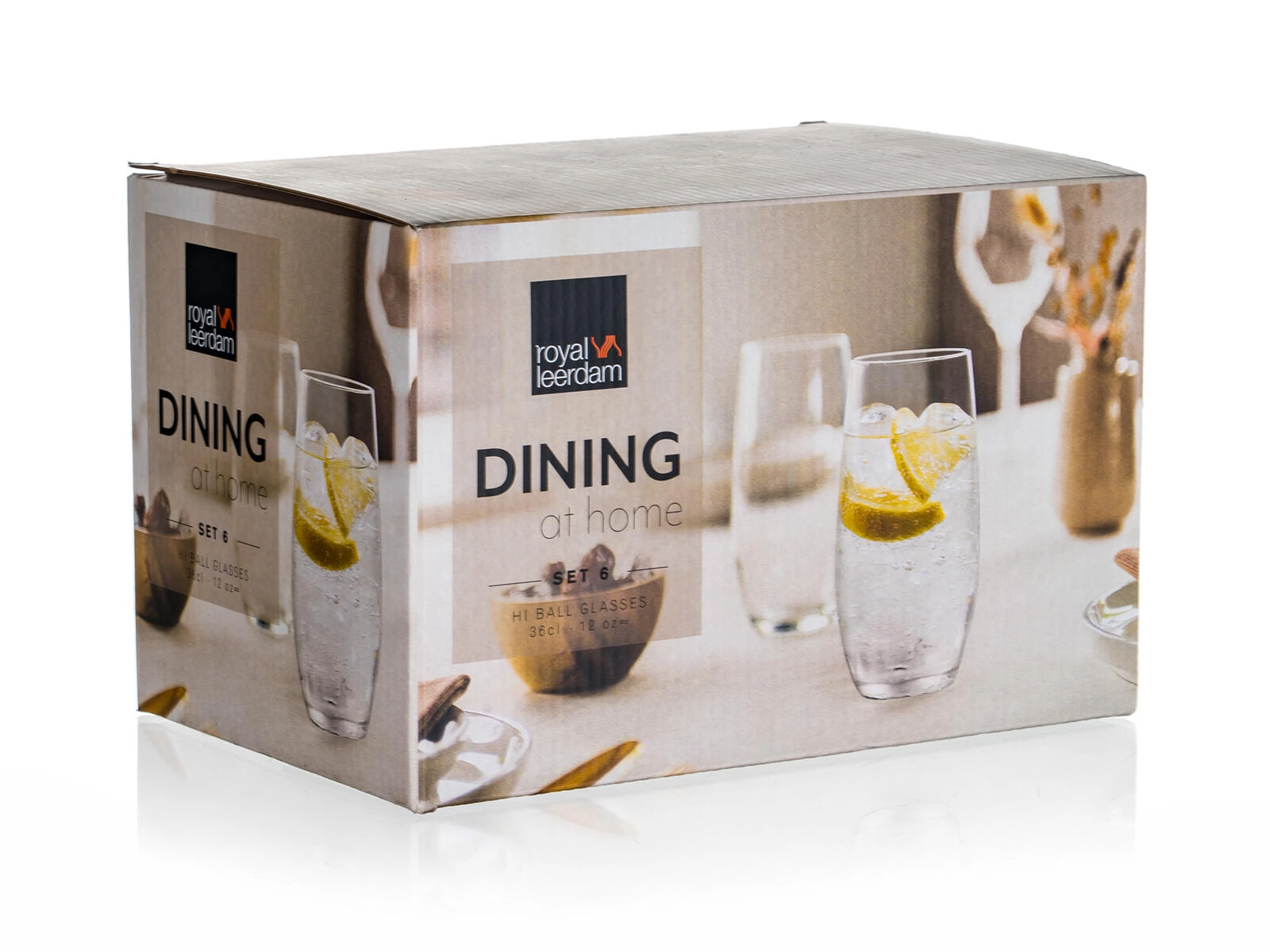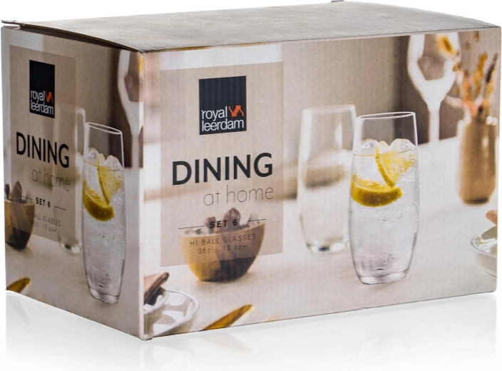 De elegante DINING-glas med en kapacitet på 360 ml fra ROYAL LEERDAM er ideelle til daglig servering af vand, limonader, juicer og cocktails. De udmærker sig ved en solid, stabil bund, en hærdet kant for længere levetid og kvalitets hollandsk glas med perfekt klarhed.