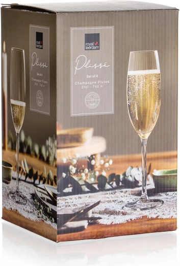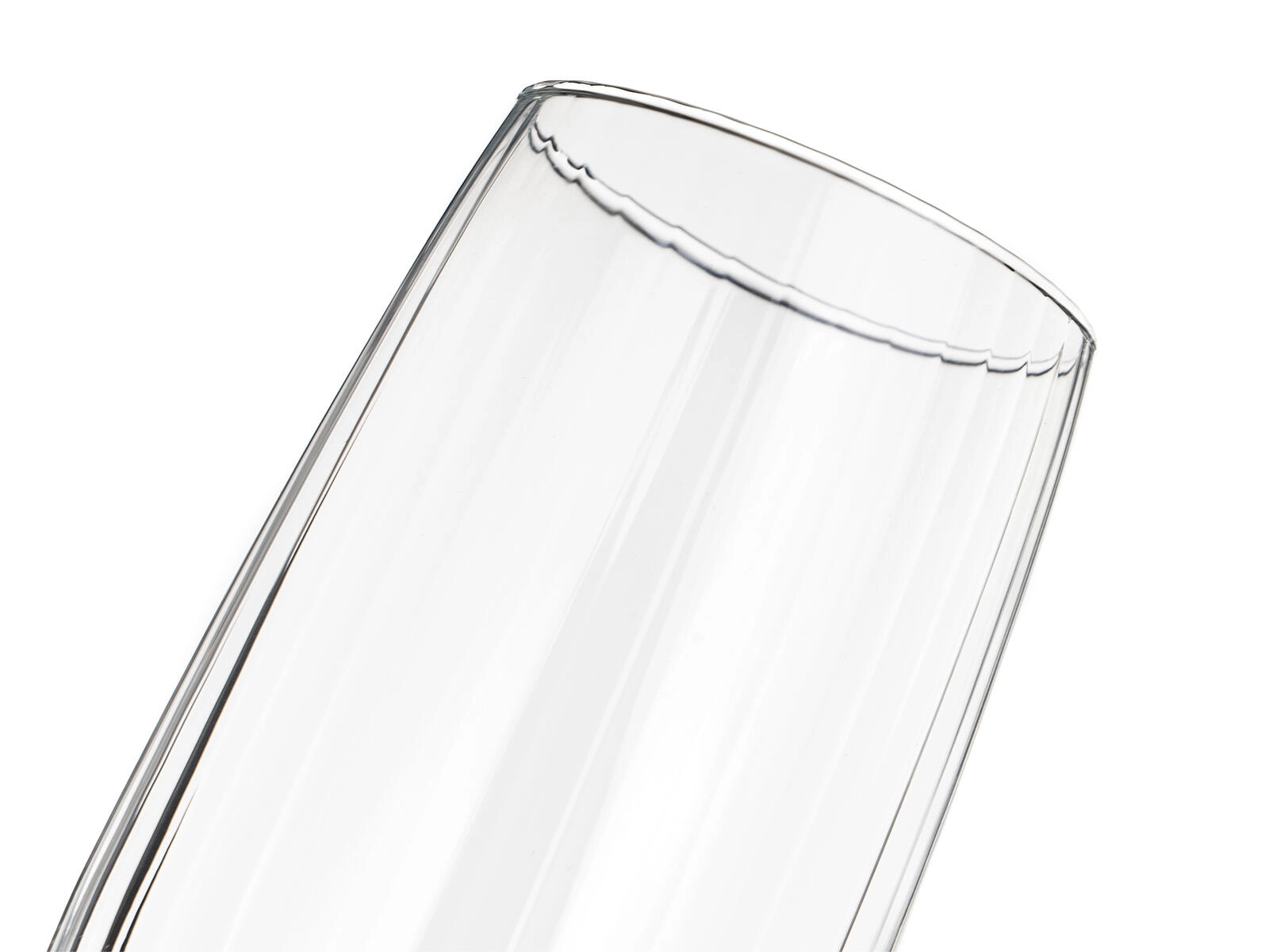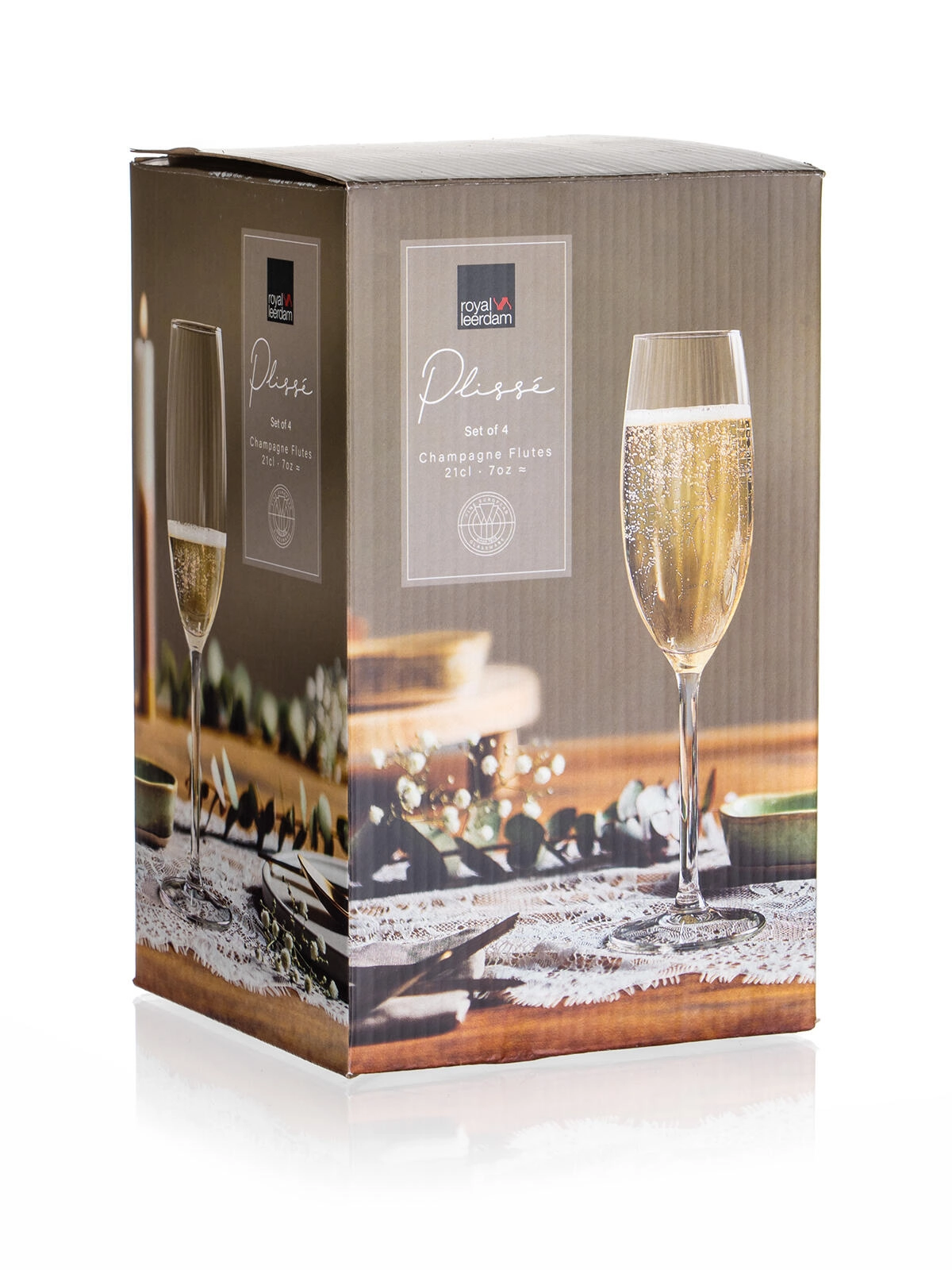 Glasene ROYAL LEERDAM Plissé er designet til perfekt servering af champagne og andre mousserende vine. Den slanke krop hjælper med at bevare den fine perlende effekt og den friske duft, mens de rene linjer og det krystalklare glas elegant fremhæver drikkens farve.