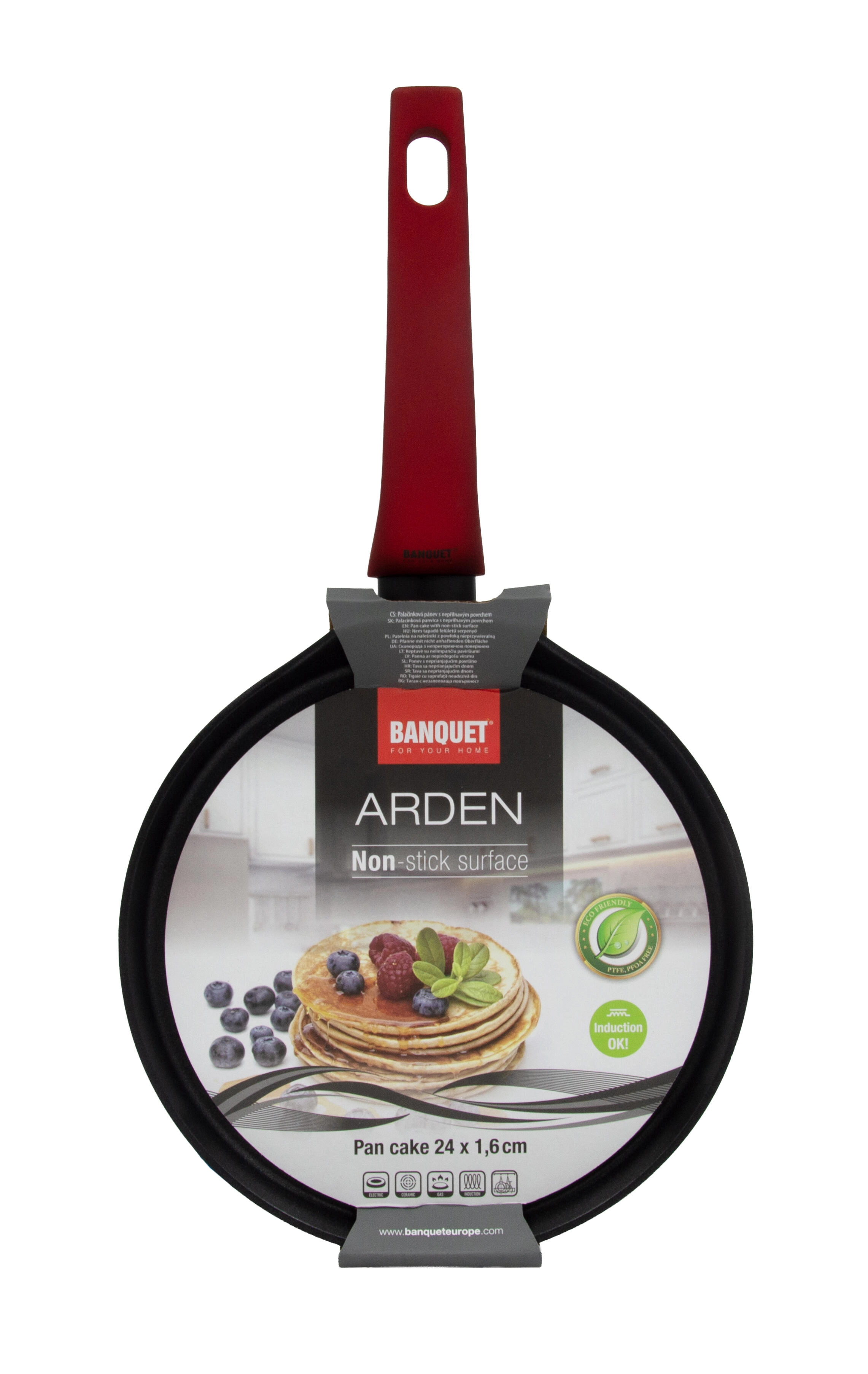 Let og holdbar pandekagepande ARDEN med en diameter på 24 cm og en lav profil for nem vending. Nonstick-belægning sikrer jævn stegning uden fastbrænding, hurtig varmedistribution og energibesparende madlavning. Den ergonomiske soft-touch-hank ligger godt i hånden, og panden er egnet til alle komfurtyper, inklusive induktion.