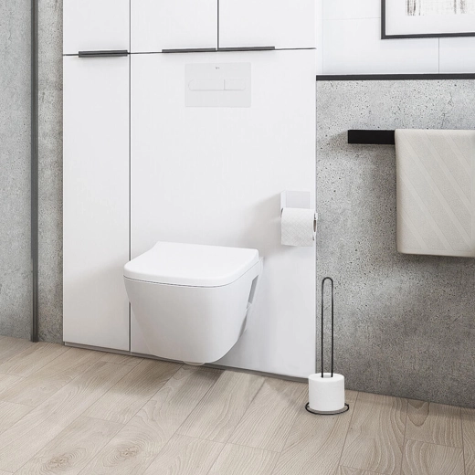 Den fritstående konstruktion muliggør øjeblikkelig placering uden boring og nem udskiftning af ruller. Den stabile, runde base holder produktet sikkert på plads, mens den slanke profil sparer plads – også i mindre badeværelser og toiletter.