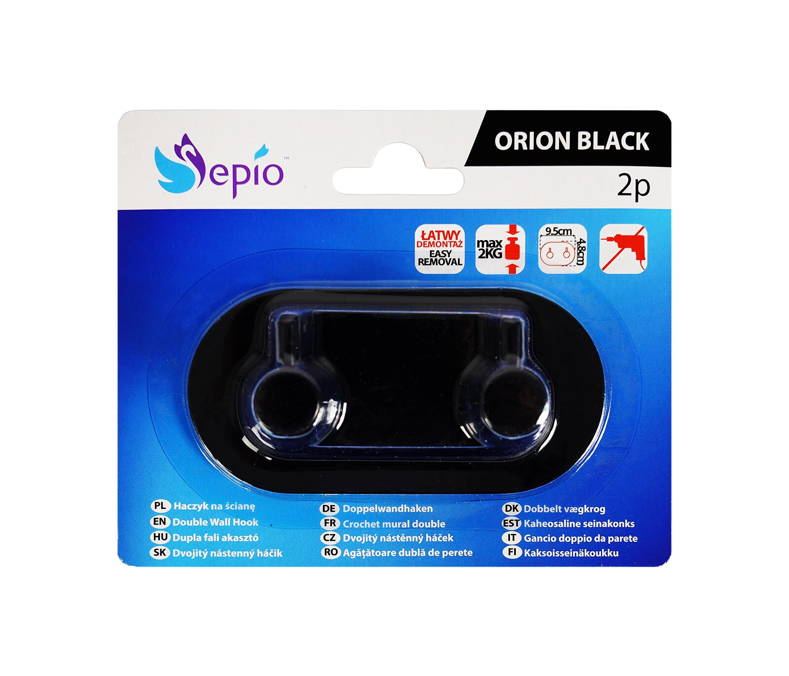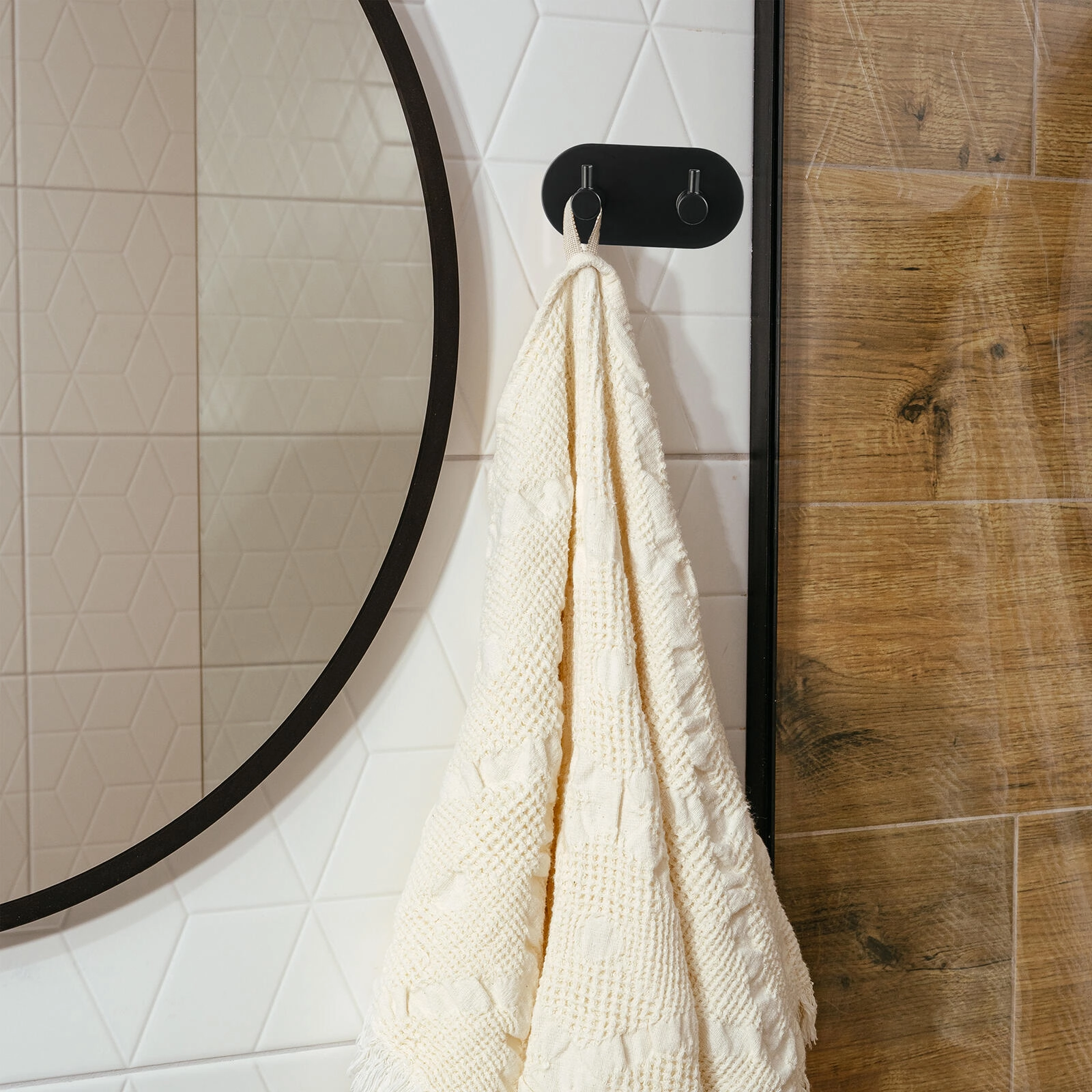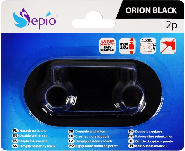 Praktisk og stilfuld selvklæbende dobbelt krog i metal i mat sort til badeværelse, entré og køkken. Takket være det stærke selvklæbende lag kan den nemt monteres uden boring og uden at beskadige fliser. De kompakte mål 9,5 × 8 × 4,5 cm og to robuste kroge sikrer orden til håndklæder, morgenkåber og nøgler.