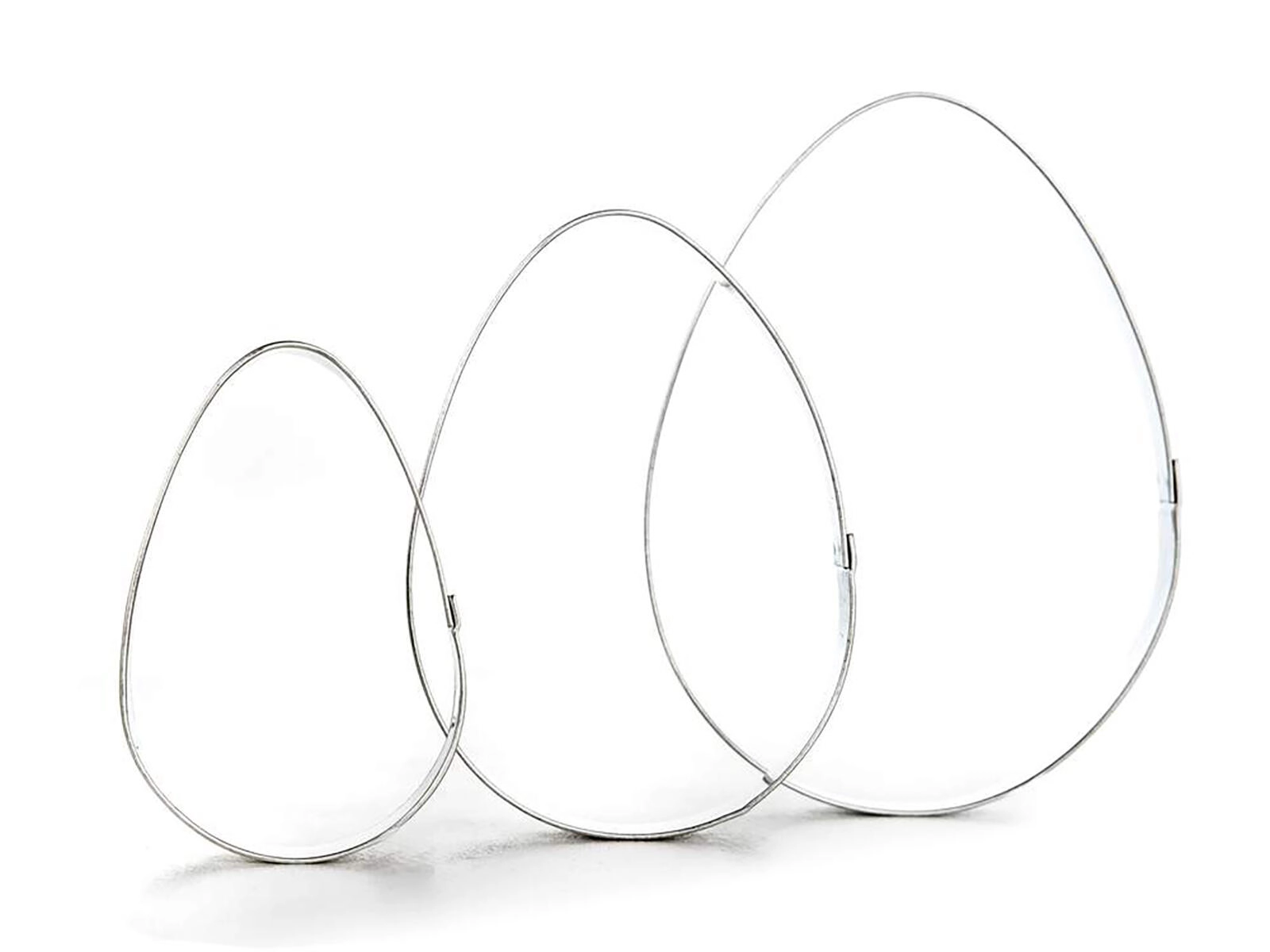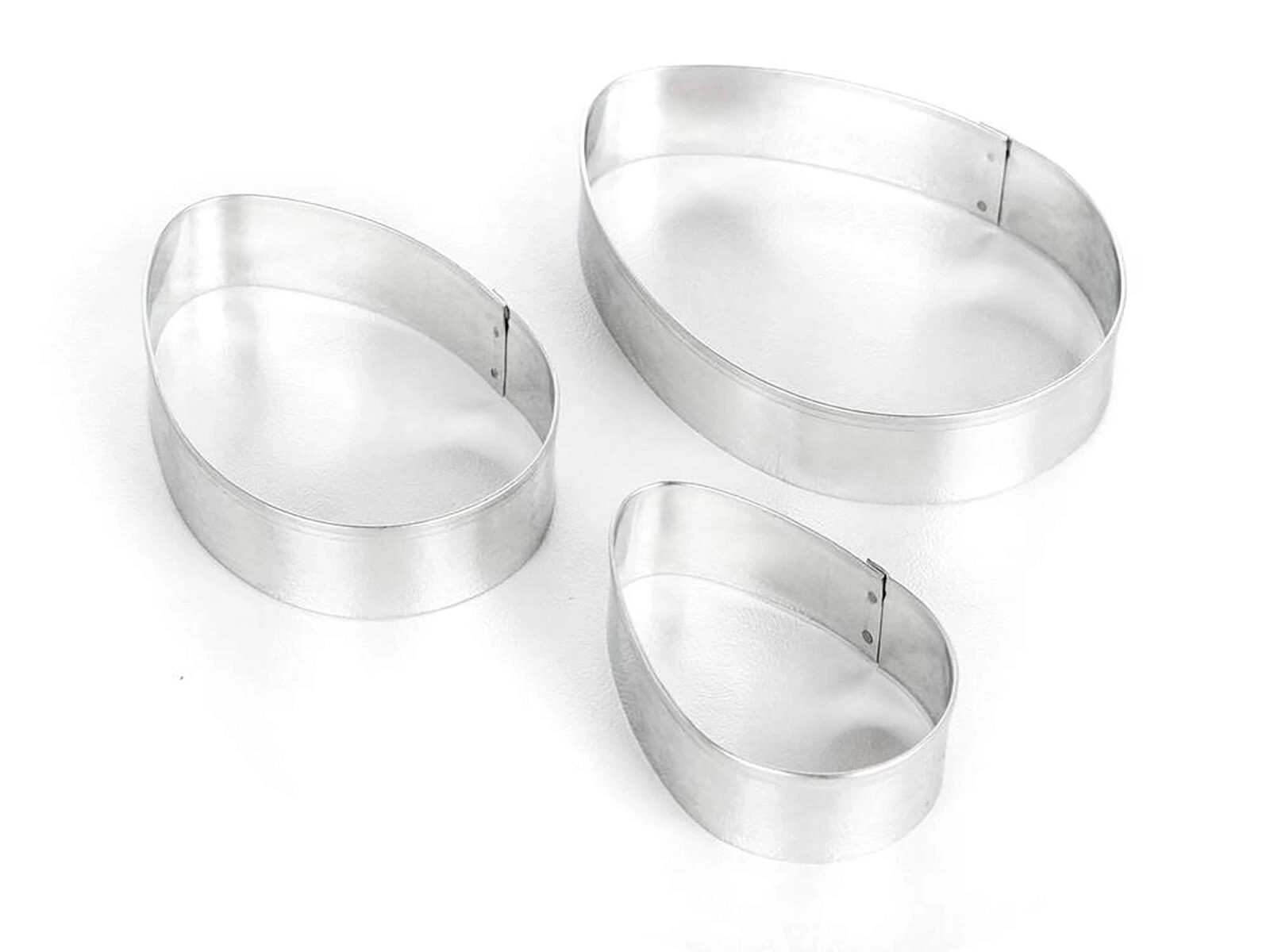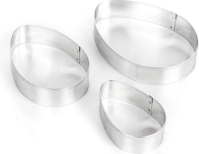 Praktisk sæt med 3 udstikkere i æggeform til nem bagning af påske- og helårs-småkager. Det robuste fortinnede pladejern sikrer rene snit og lang holdbarhed, og de tre størrelser giver mulighed for kreativ pyntning og lagdeling af former.