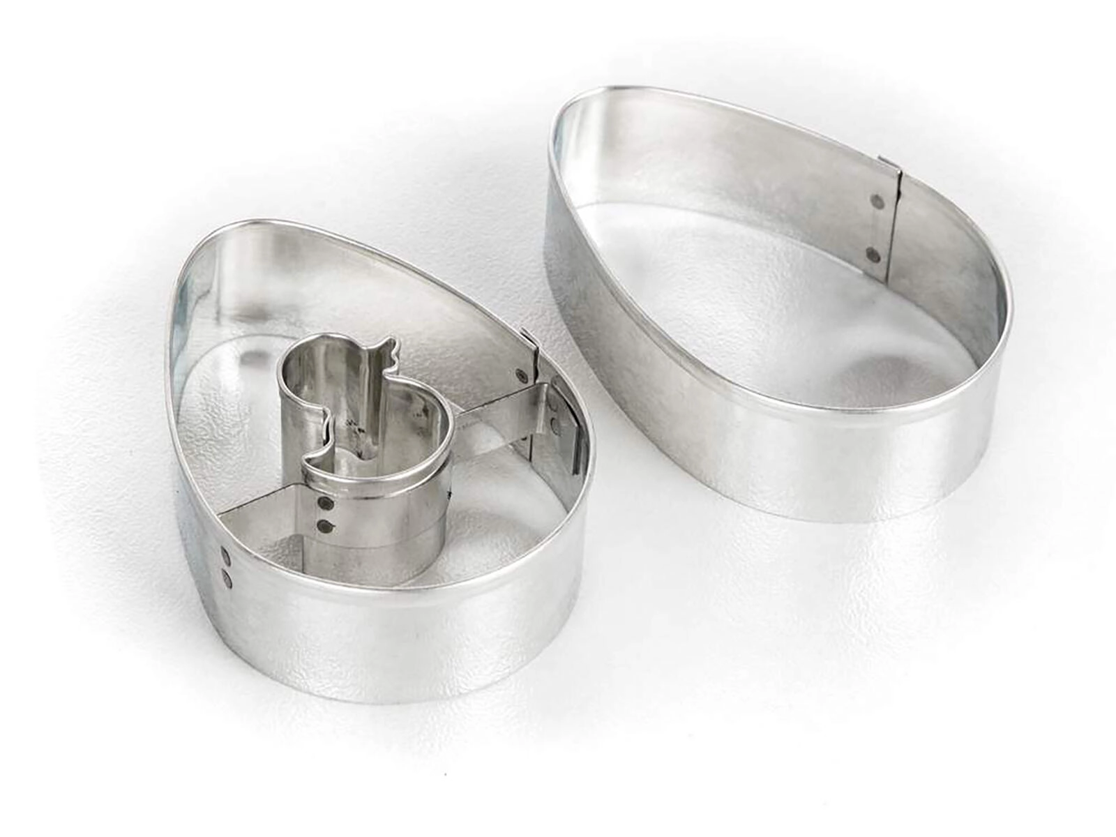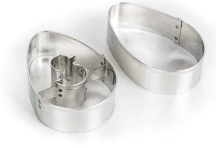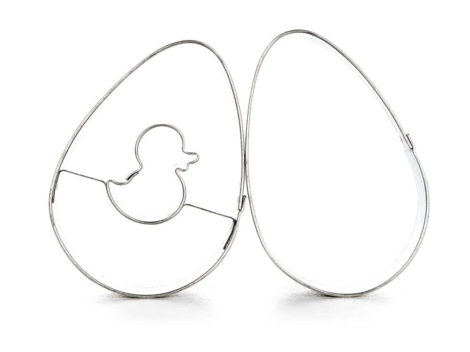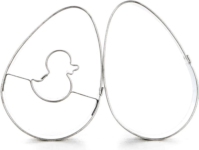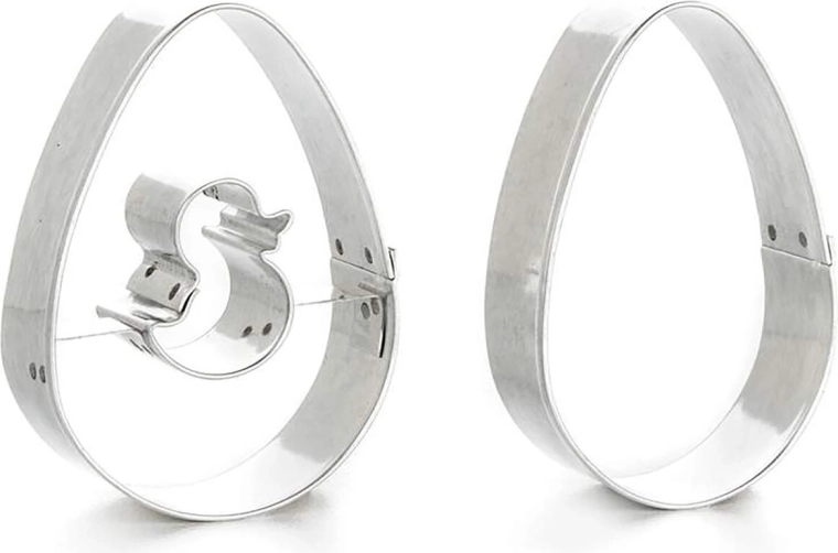 Opdag et praktisk sæt udstikkere til småkager i æggeform, ideelt til påske og helårlig bagning. Sættet indeholder et glat æg og et æg med centralt kyllingemotiv til legesyg dekoration. Udstikkerne af fortinnet blik sikrer præcise former og lang holdbarhed.