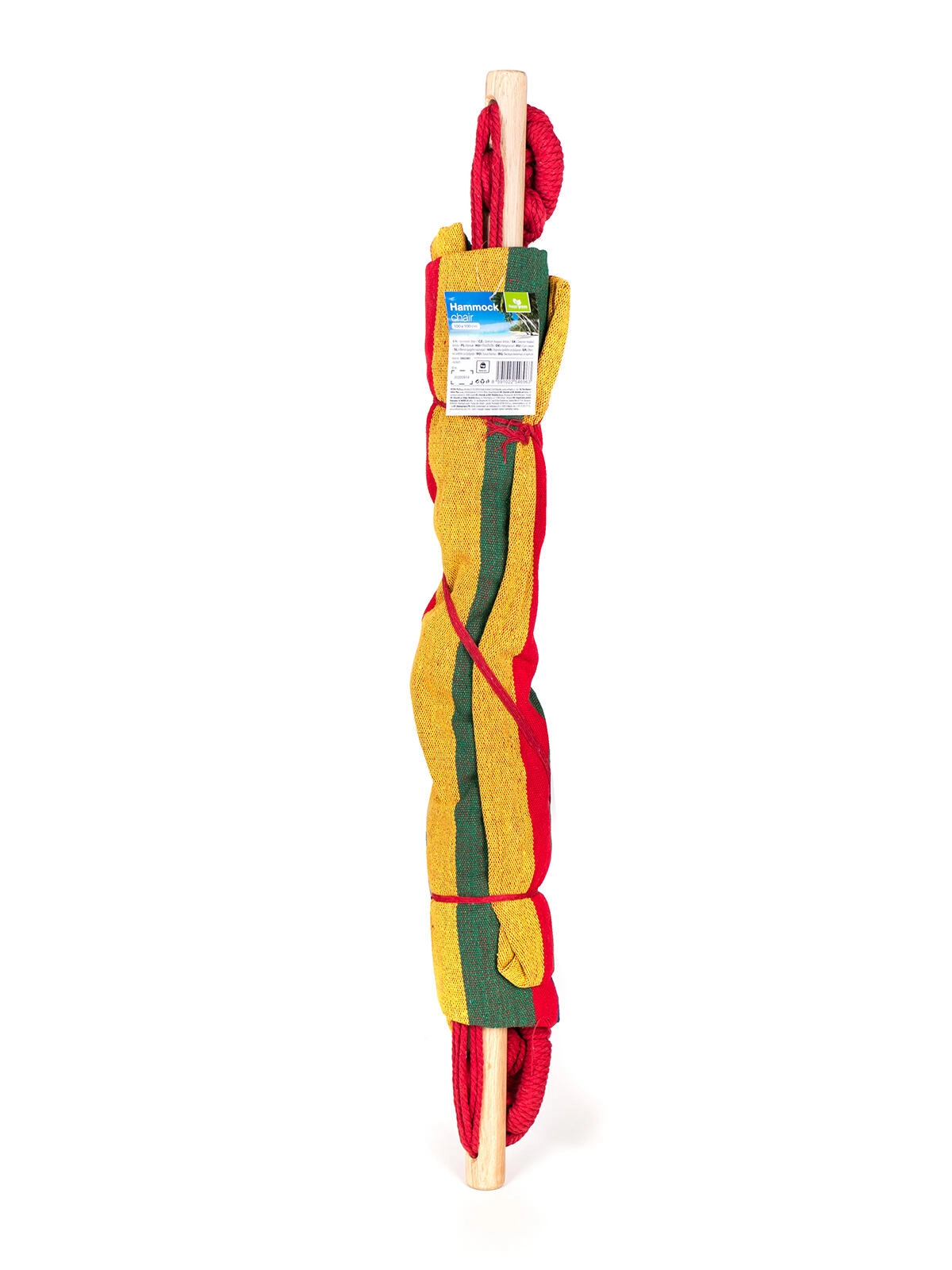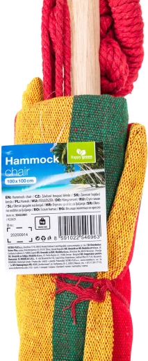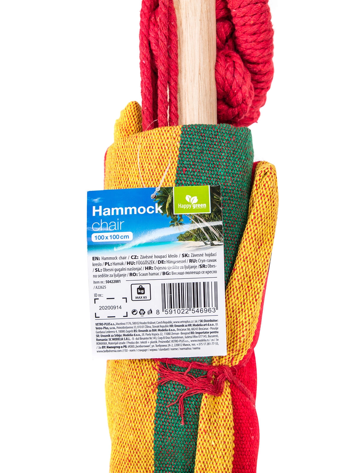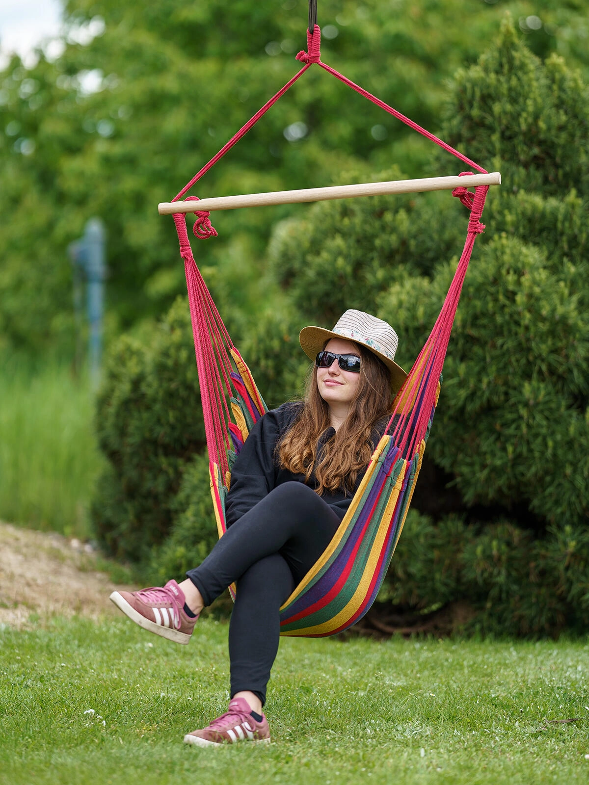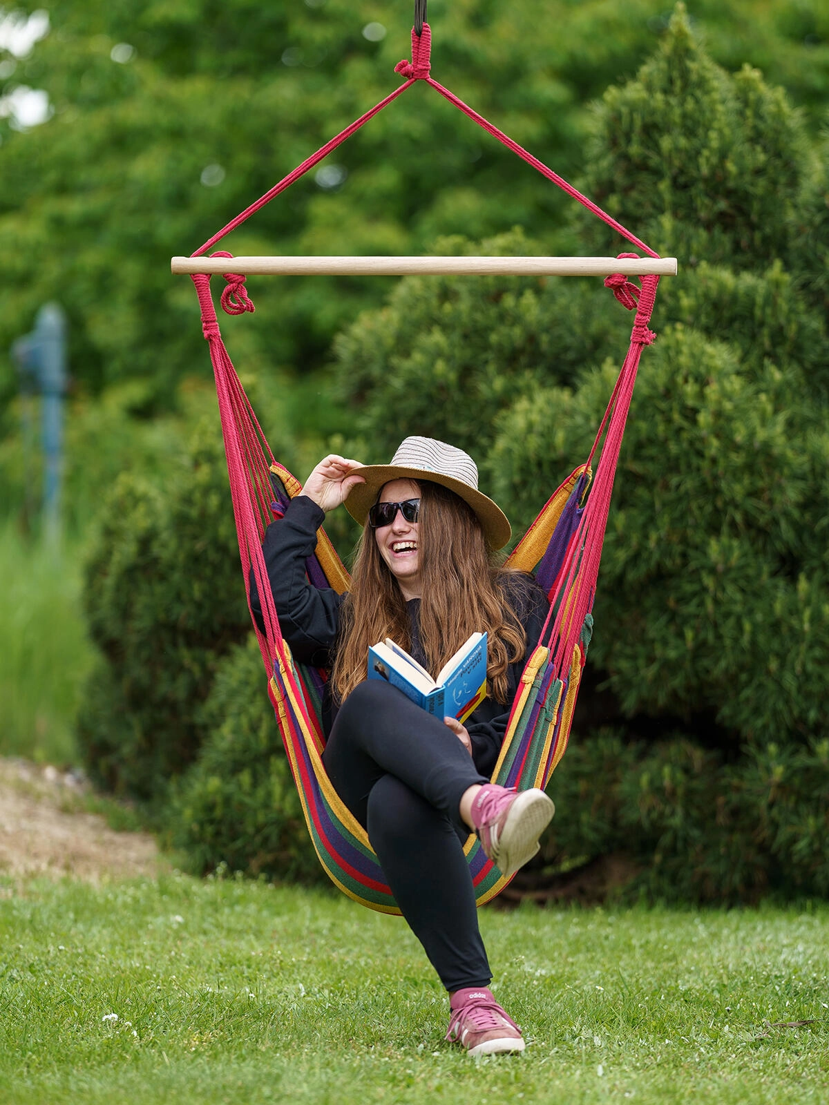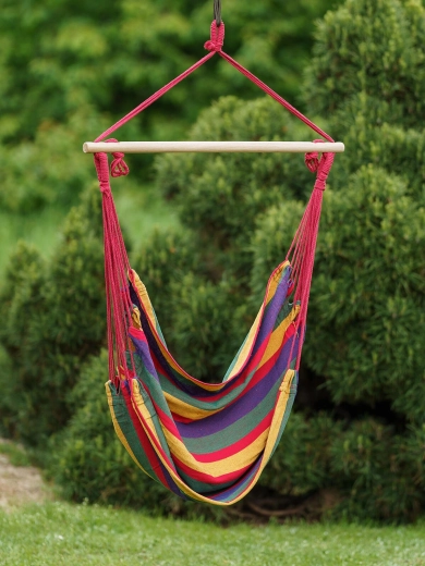 Nyd afslapning derhjemme og i haven med en hængestol med enkel ophængning i ét punkt, stabiliserende træstang og farverigt tekstil. De kompakte mål på 100 × 100 cm og bæreevne på 85 kg sikrer en behagelig siddeplads på terrasse, altan og indendørs.