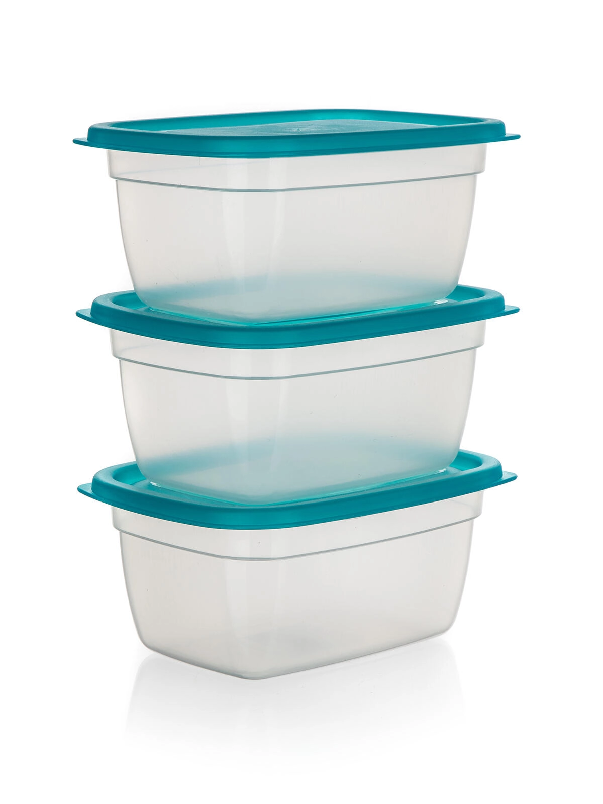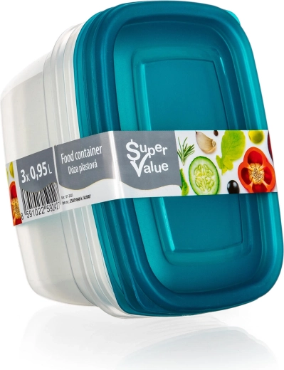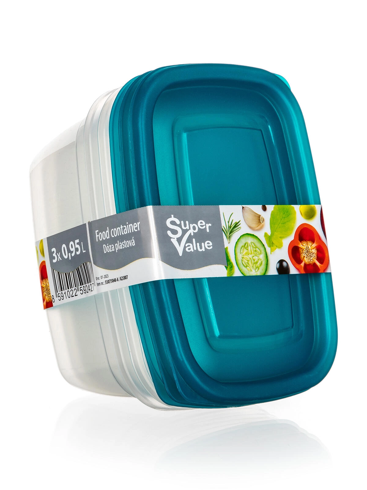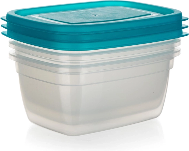 Praktisk 3-delt sæt madbeholdere med en kapacitet på 0,95 l med tætsluttende låg i turkis. Ideelle til at bevare friskhed, forberedelse af måltider på forhånd og transport af snacks. Takket være det stabelbare og gennemsigtige design sparer du let plads og kan altid se, hvad der er indeni.