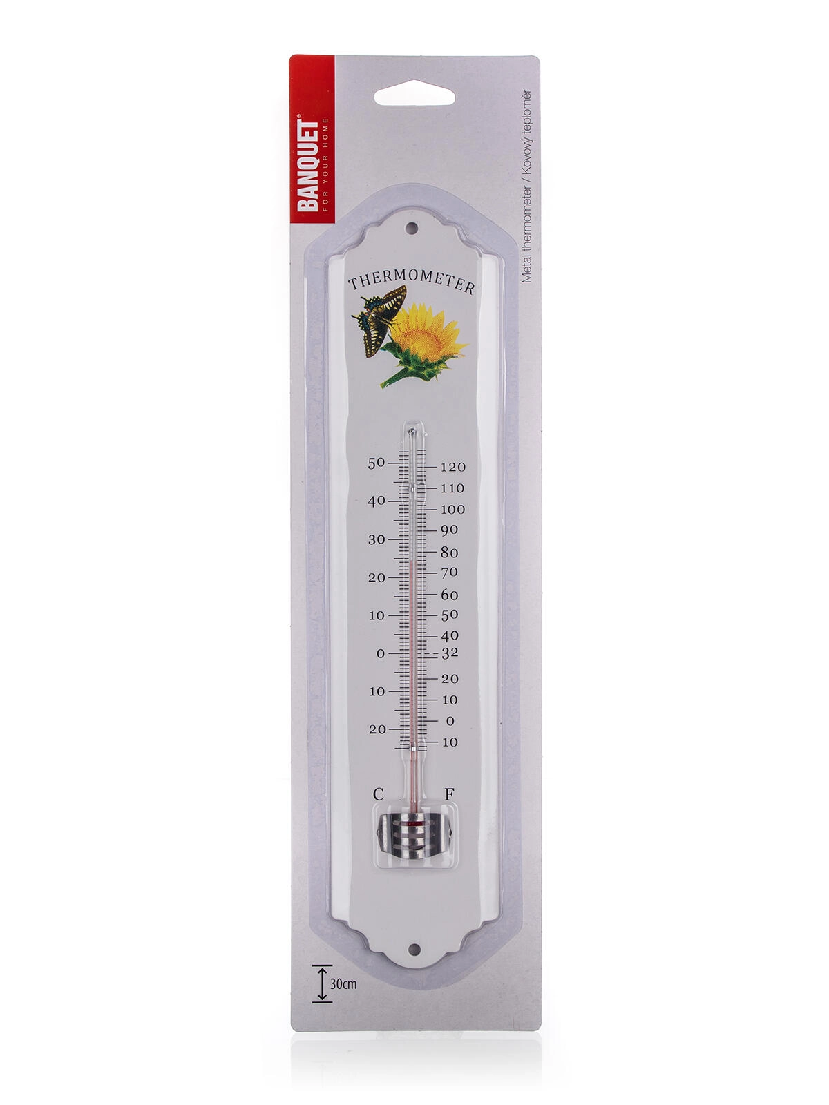 Dette stilfulde vægmonterede metaltermometer kombinerer praktisk temperaturmåling med et dekorativt udtryk. Takket være den dobbelte skala i Celsius og Fahrenheit kan du nemt tjekke den aktuelle temperatur uanset foretrukne enheder.