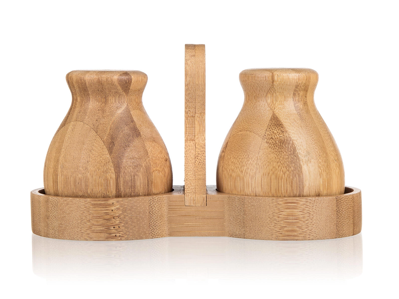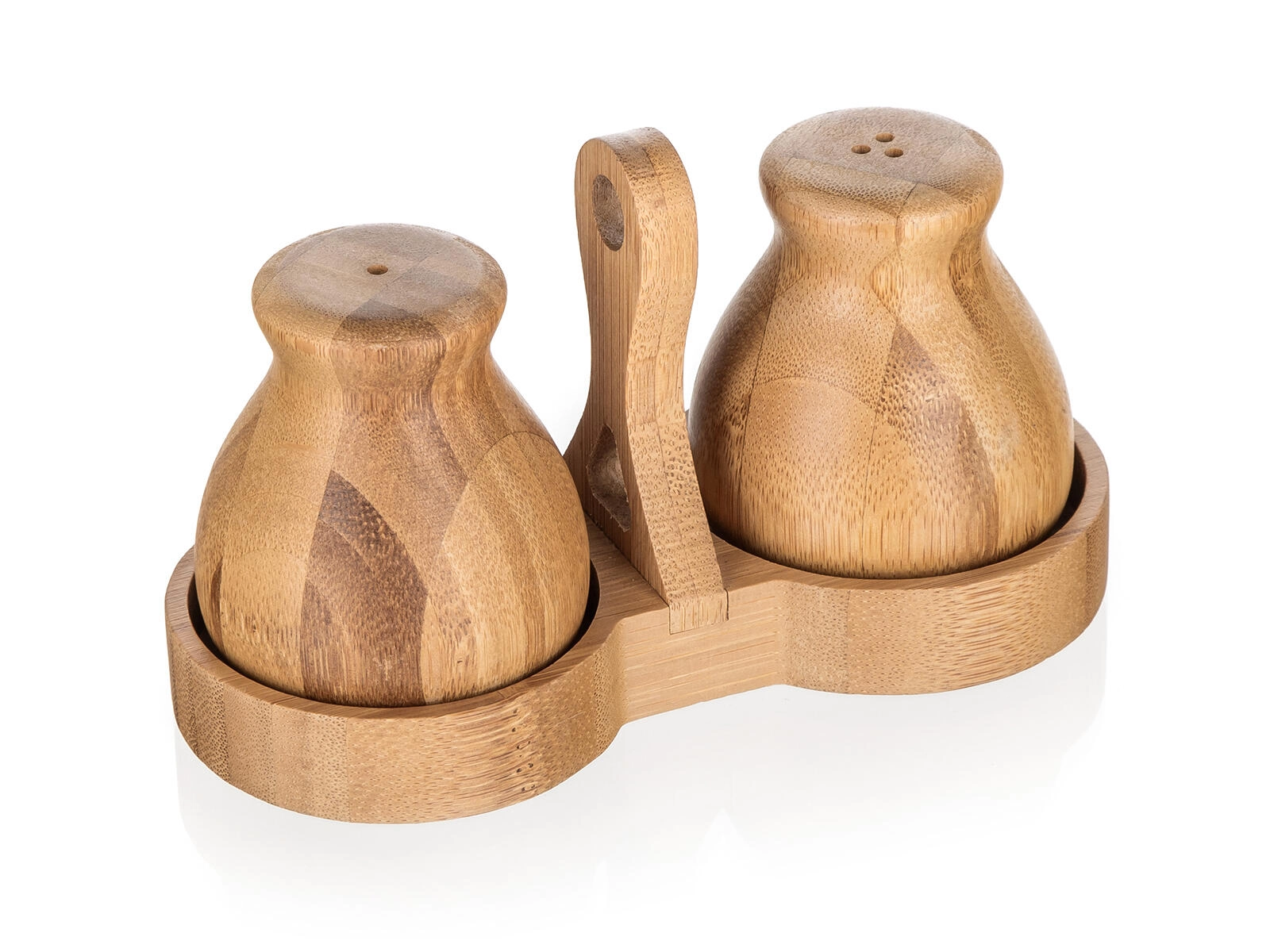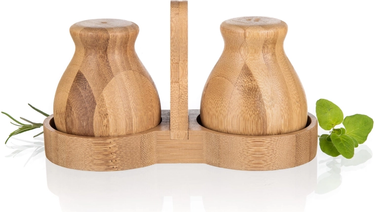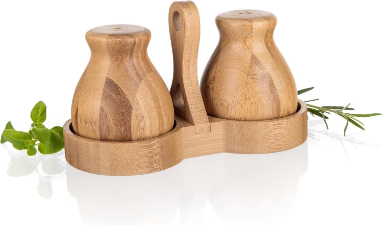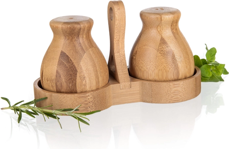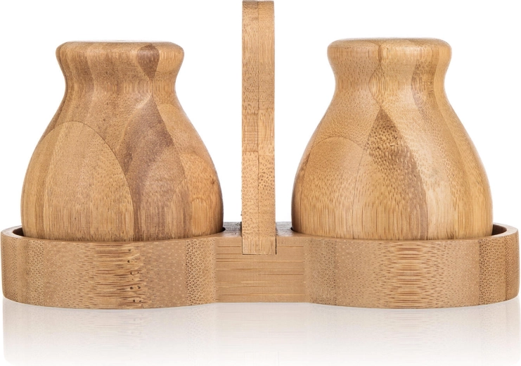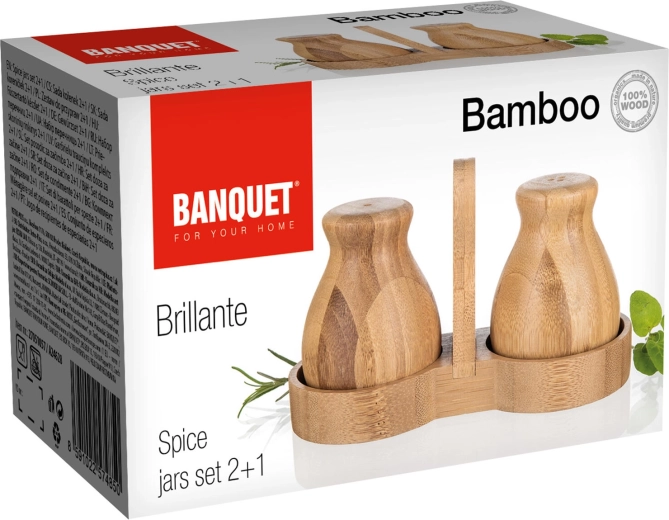 Denne bambus salt- og peberbøsse BRILLANTE Bamboo forener æstetik og funktionalitet. Det naturlige materiale med fint slebet overflade føles varmt og indbydende, mens den kompakte holder med centralt håndtag sikrer stabil opbevaring og nem flytning på bordet.