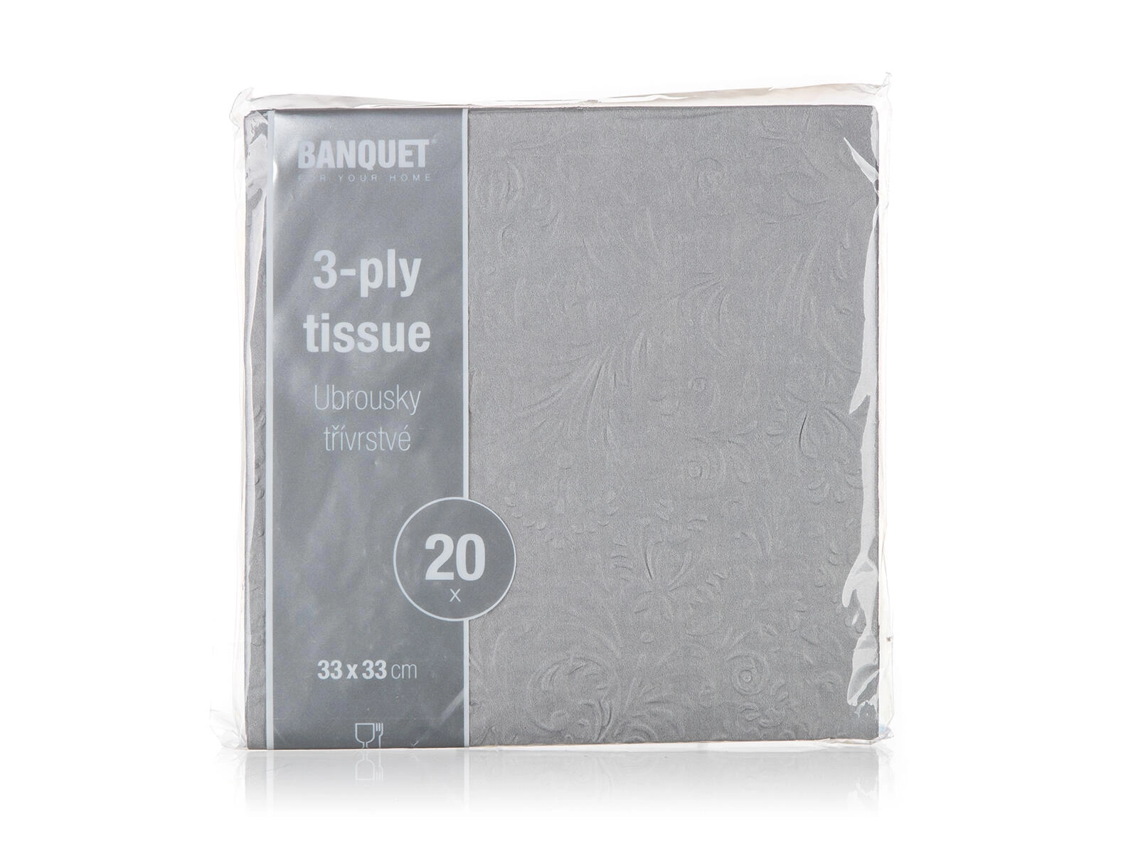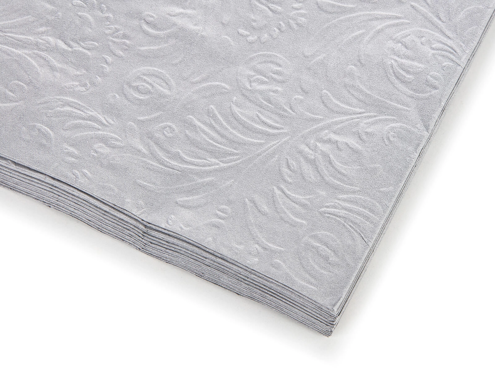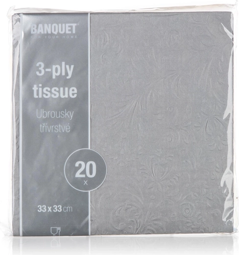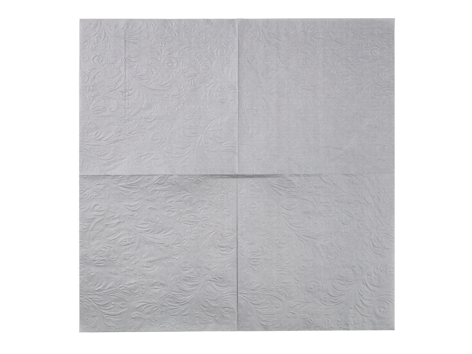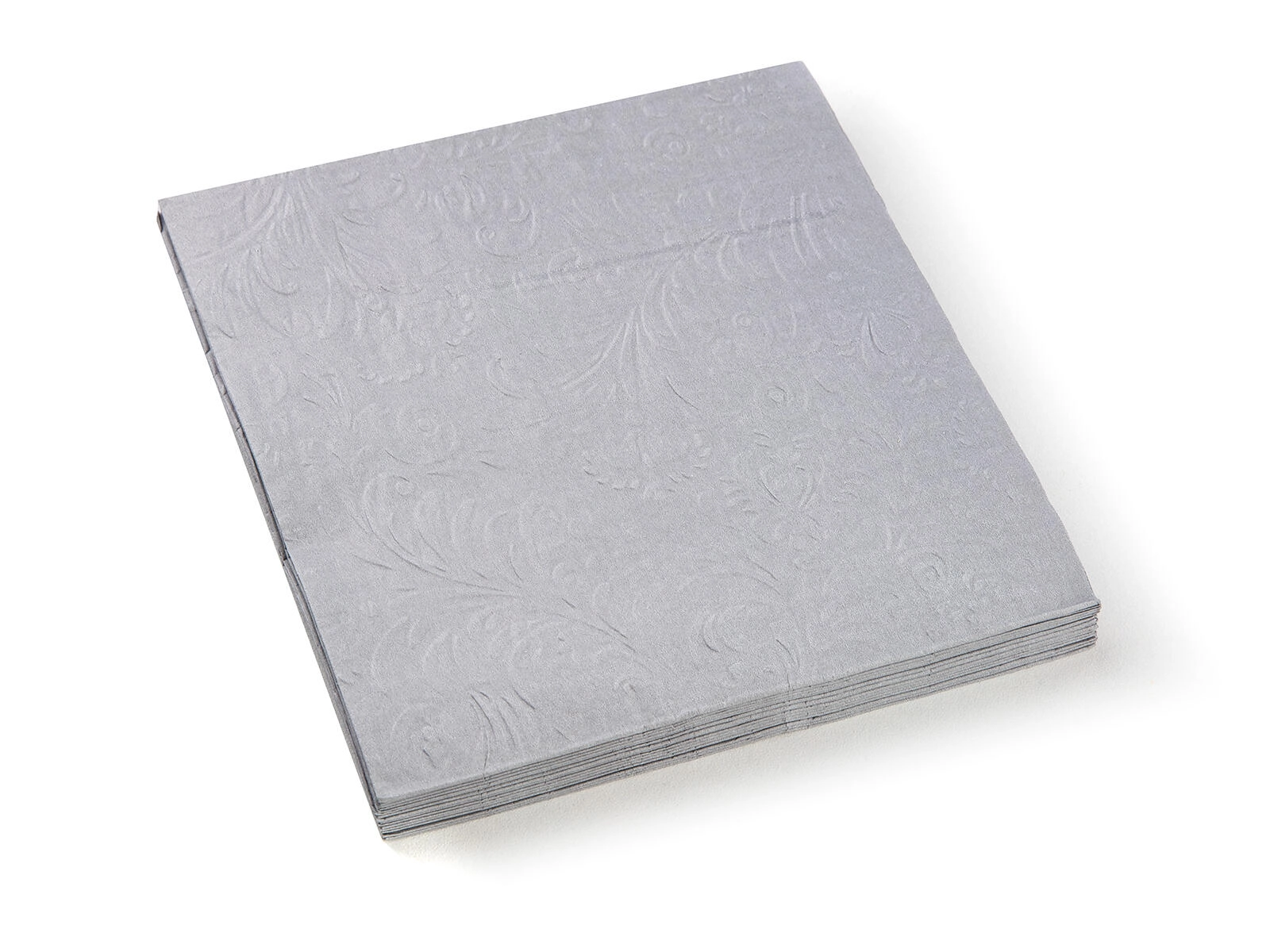Gør borddækningen komplet med grå servietter med elegant relief, der giver et premium look. Takket være de 3 lag er de behagelige at røre ved, holdbare og klarer sikkert små spild og pletter. Den universelle størrelse 33 × 33 cm passer til frokost, middag og servering ved festlige lejligheder.