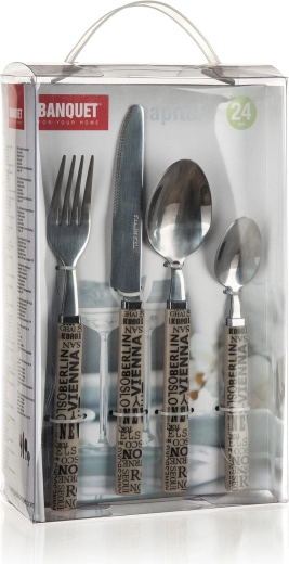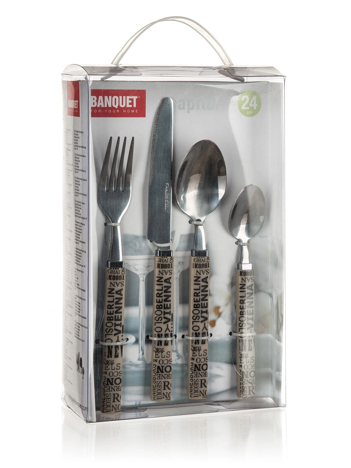 Elegant bestiksæt CAPITAL i et praktisk sæt med 24 dele til 6 personer, fremstillet af kvalitets rustfrit stål 18/0 med blank overflade og behagelige plastikhåndtag med dekor. Ideelt til både hverdagsbrug og festlige lejligheder.