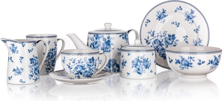 Skab et ensartet Blue Flower-serveringssæt – kande, kopper, sukkerskål og andre dele i samme dekor.