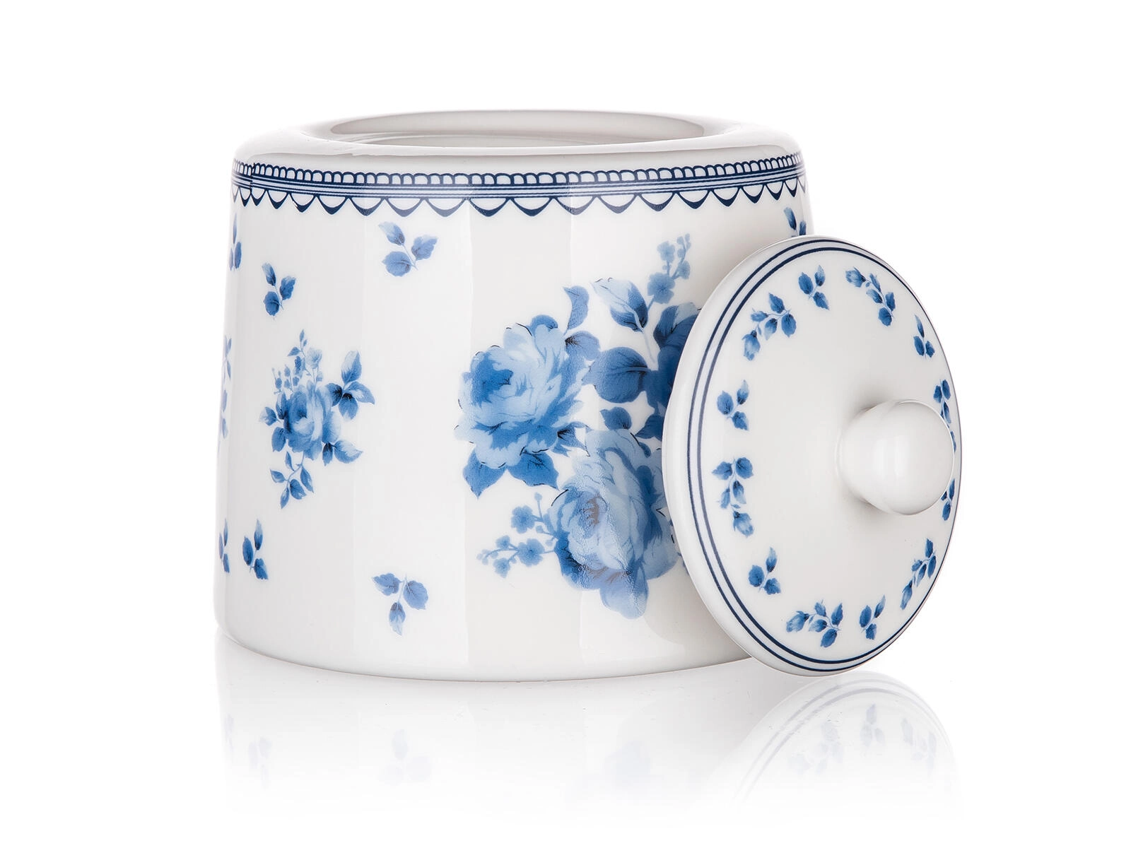 Denne stilfulde sukkerskål med en højde på 9,5 cm udmærker sig ved en klassisk hvid base med blåt blomsterdekor og et praktisk låg med rundt greb. Den fuldender dit bord ved servering af kaffe eller te og er let at vedligeholde takket være den kvalitetsrige glasur.