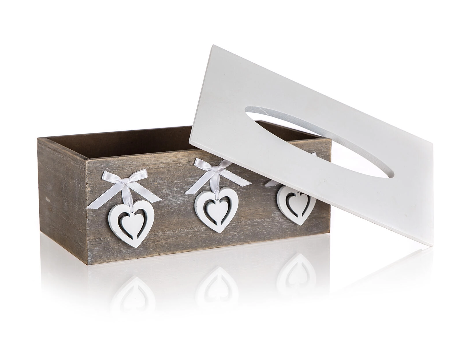 Stilfuld boks til papirservietter med HEART-motiv og en praktisk oval åbning, der giver en elegant måde at have servietter altid lige ved hånden. Takket være det åbne-låg kan den nemt fyldes op, og de kompakte mål 24 × 13,5 × 9,5 cm passer i ethvert rum.