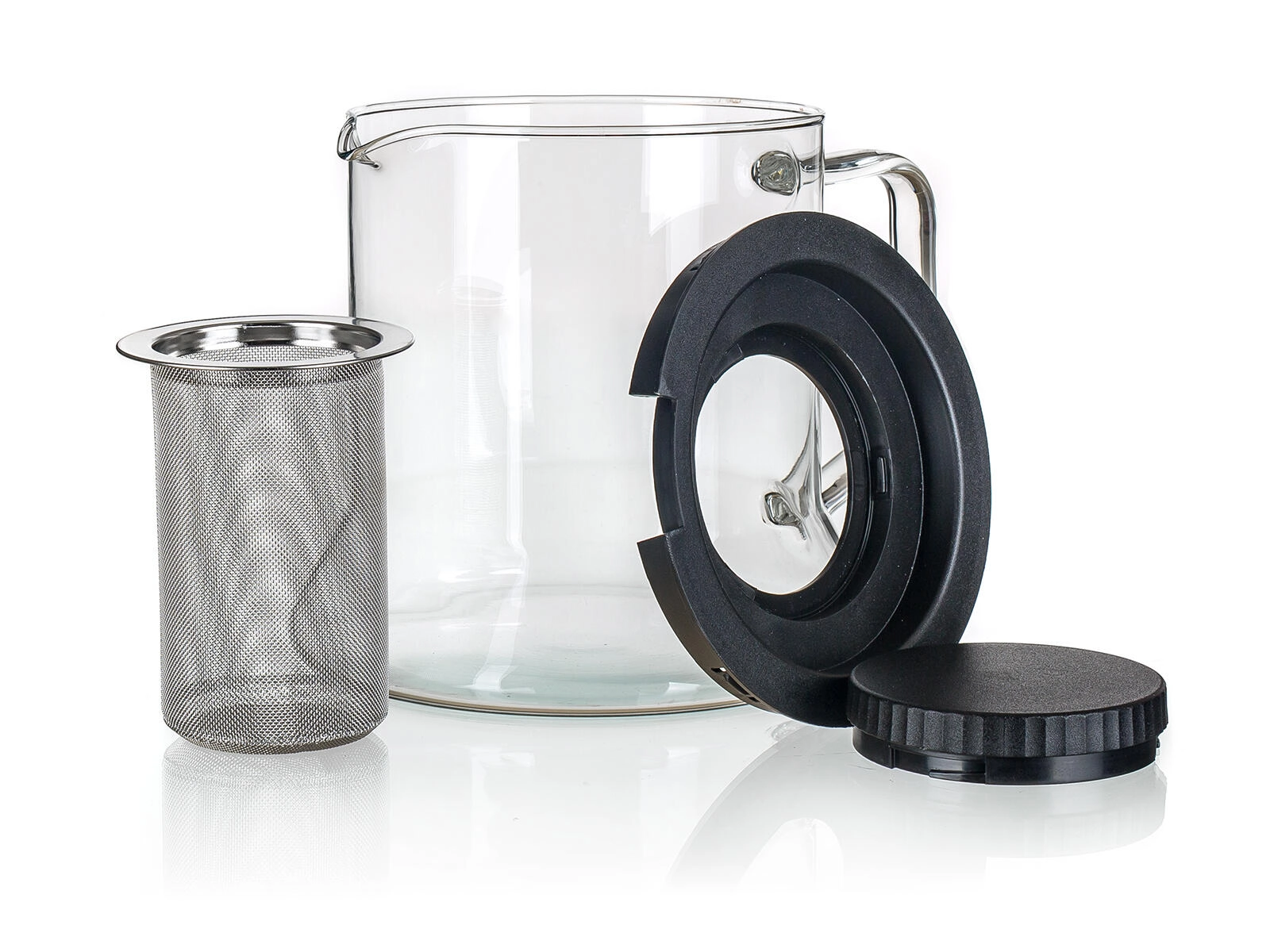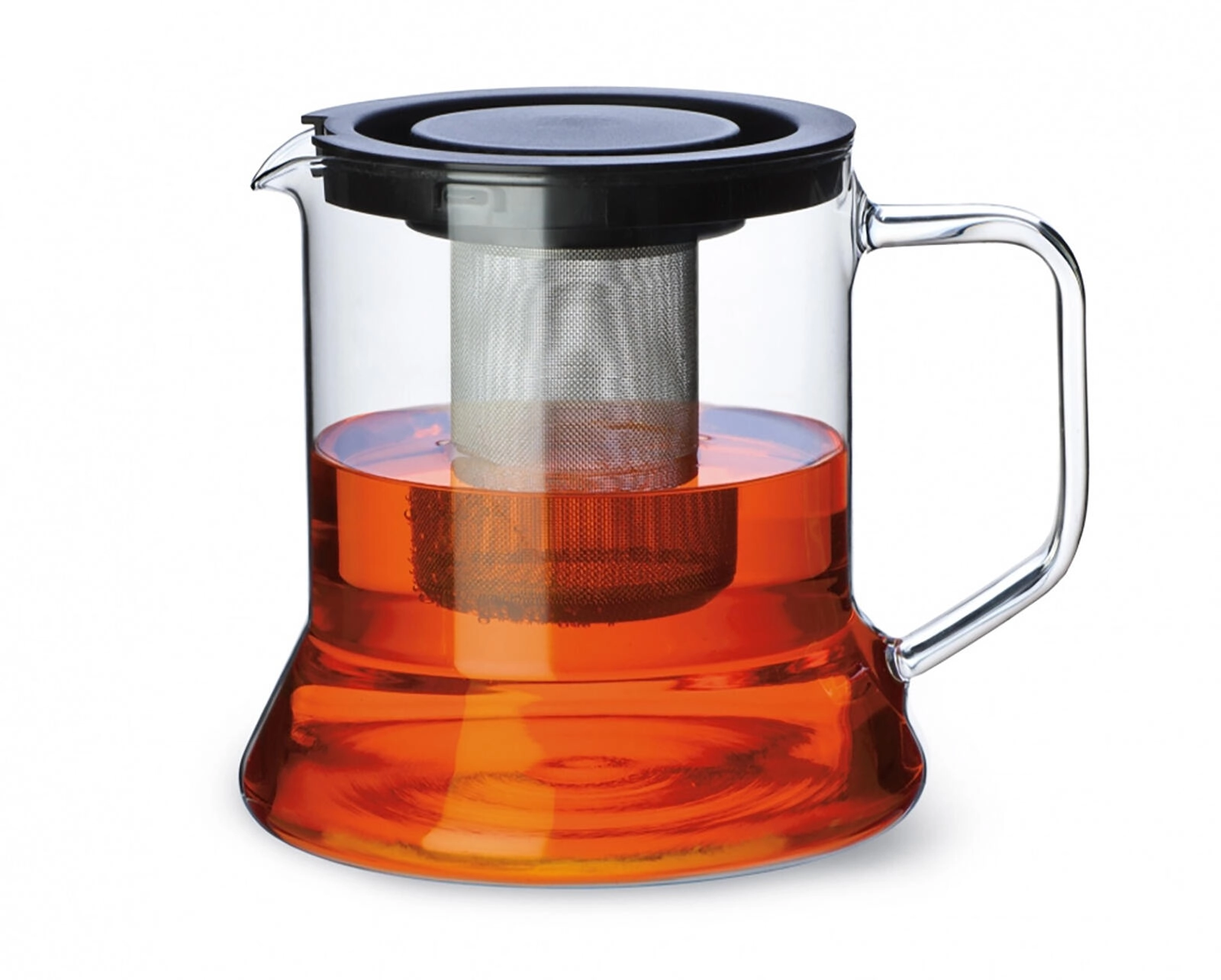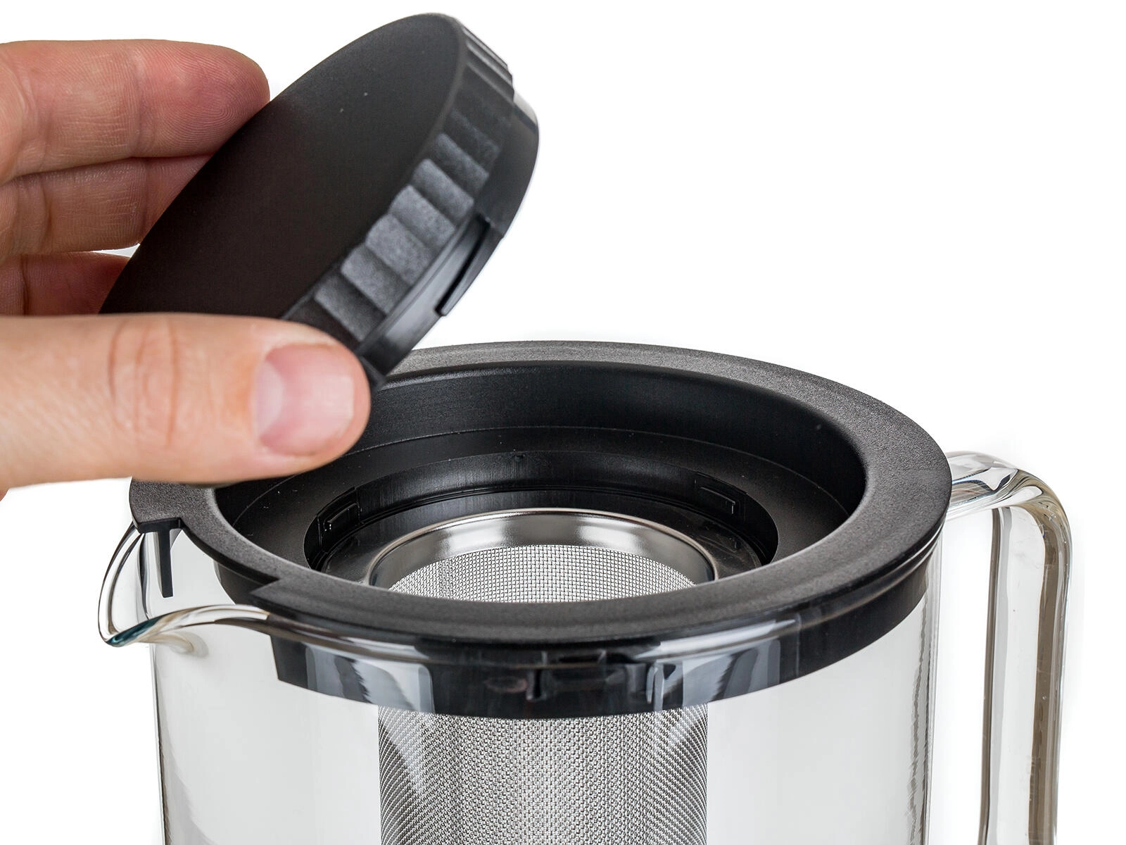 Det fine rustfri stålsi opfanger selv små blade og urter og kan nemt tages ud, hvis du vil bruge kanden uden filter. Den glatte, ikke-porøse overflade er hygiejnisk og nem at vedligeholde – både kanden og delene kan vaskes i opvaskemaskinen. Plastlåget slutter godt tæt, og det behagelige glashåndtag sikrer sikker udskænkning.