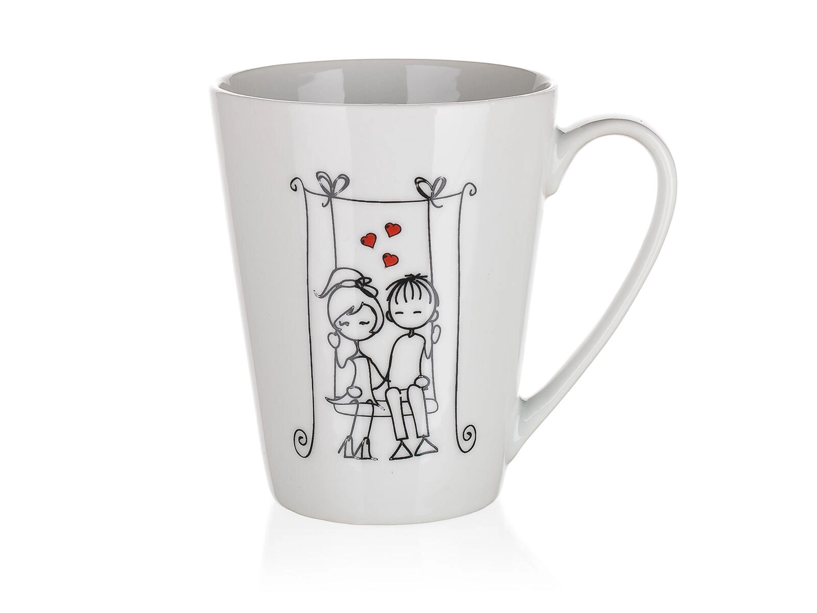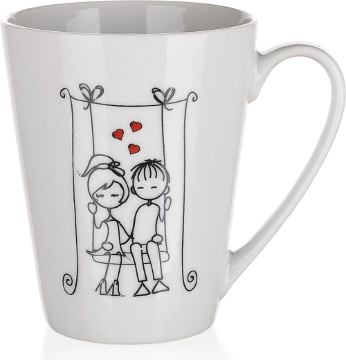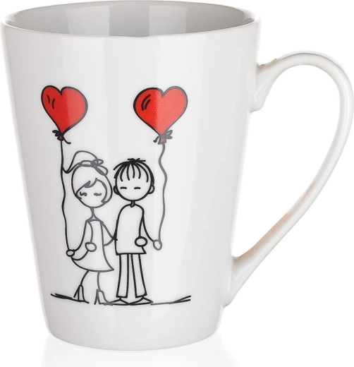 Nyd dine yndlingsdrikke, varme såvel som kolde, i det elegante keramiske krus LOVE med en kapacitet på 330 ml. Takket være den højere, let koniske form ligger det godt i hånden, er behageligt at drikke af, og de romantiske dekorationer med motiver af par og hjerter glæder både som gave og i hverdagen.