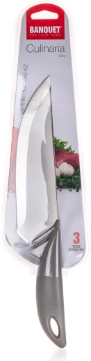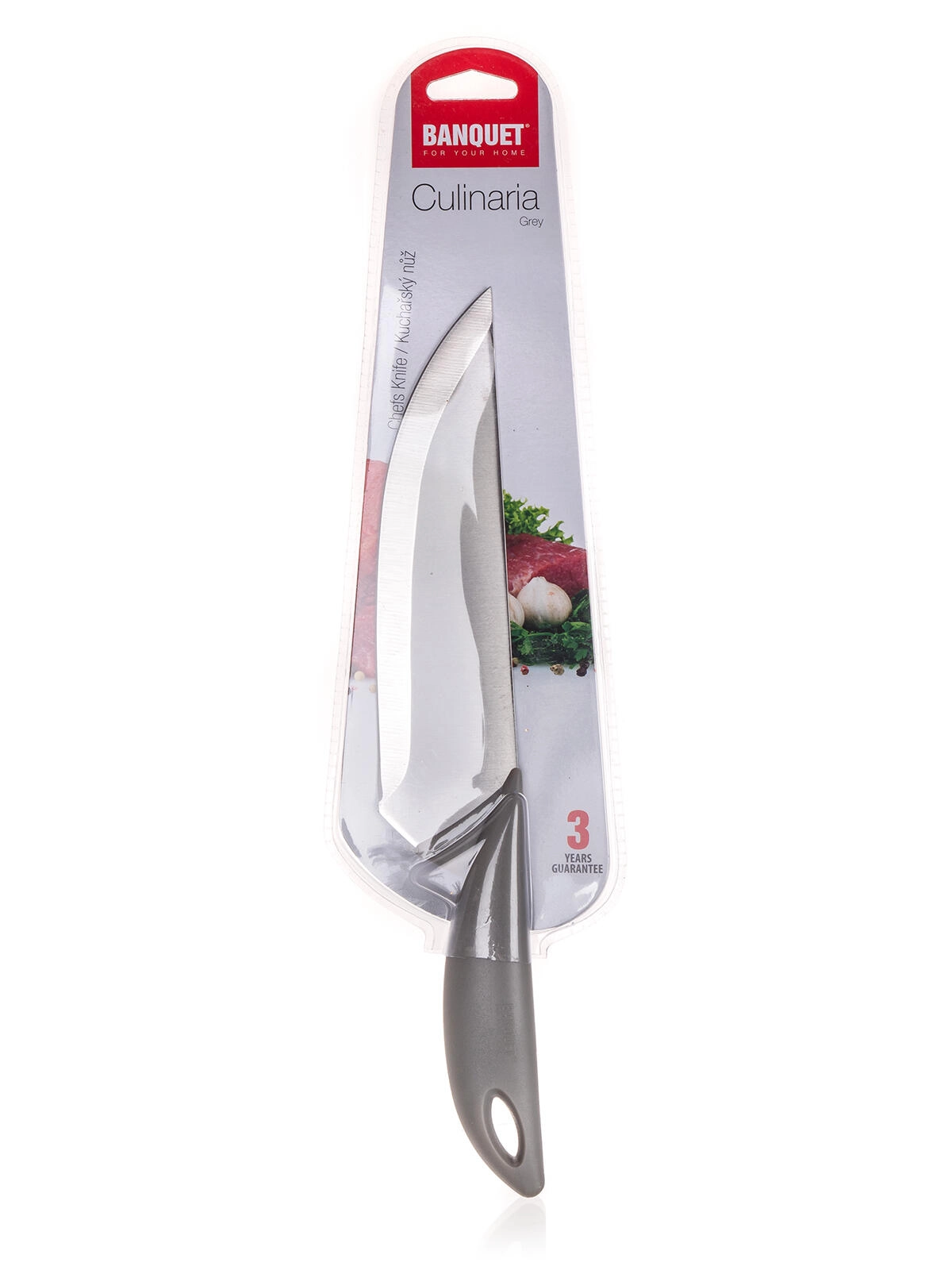 CULINARIA Grey kokkekniv er en pålidelig hjælper til den daglige madlavning. Takket være den stålskær og den afbalancerede konstruktion klarer den nemt skæring af grøntsager, kød og krydderurter. Det ergonomiske plastikhåndtag sikrer et fast greb og komfort ved længere tids brug.