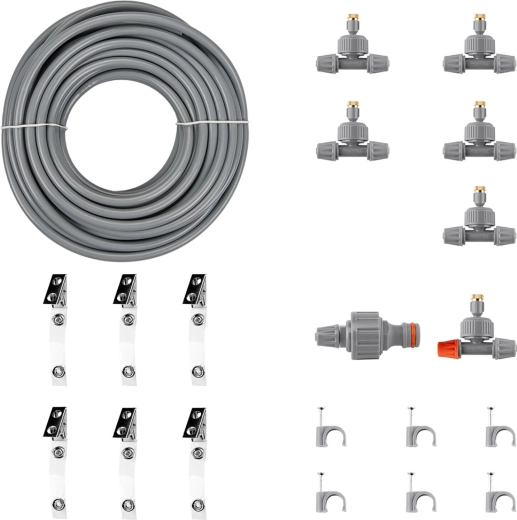 Pakken indeholder robuste messingdyser inklusiv en endedyse med lukning, monterings- og ophængsklemmer for nem fastgørelse samt et filter til beskyttelse mod urenheder. Tågen kan rettes takket være vinkeljustering, og dyserne kan nemt renses for vedvarende ydeevne.
