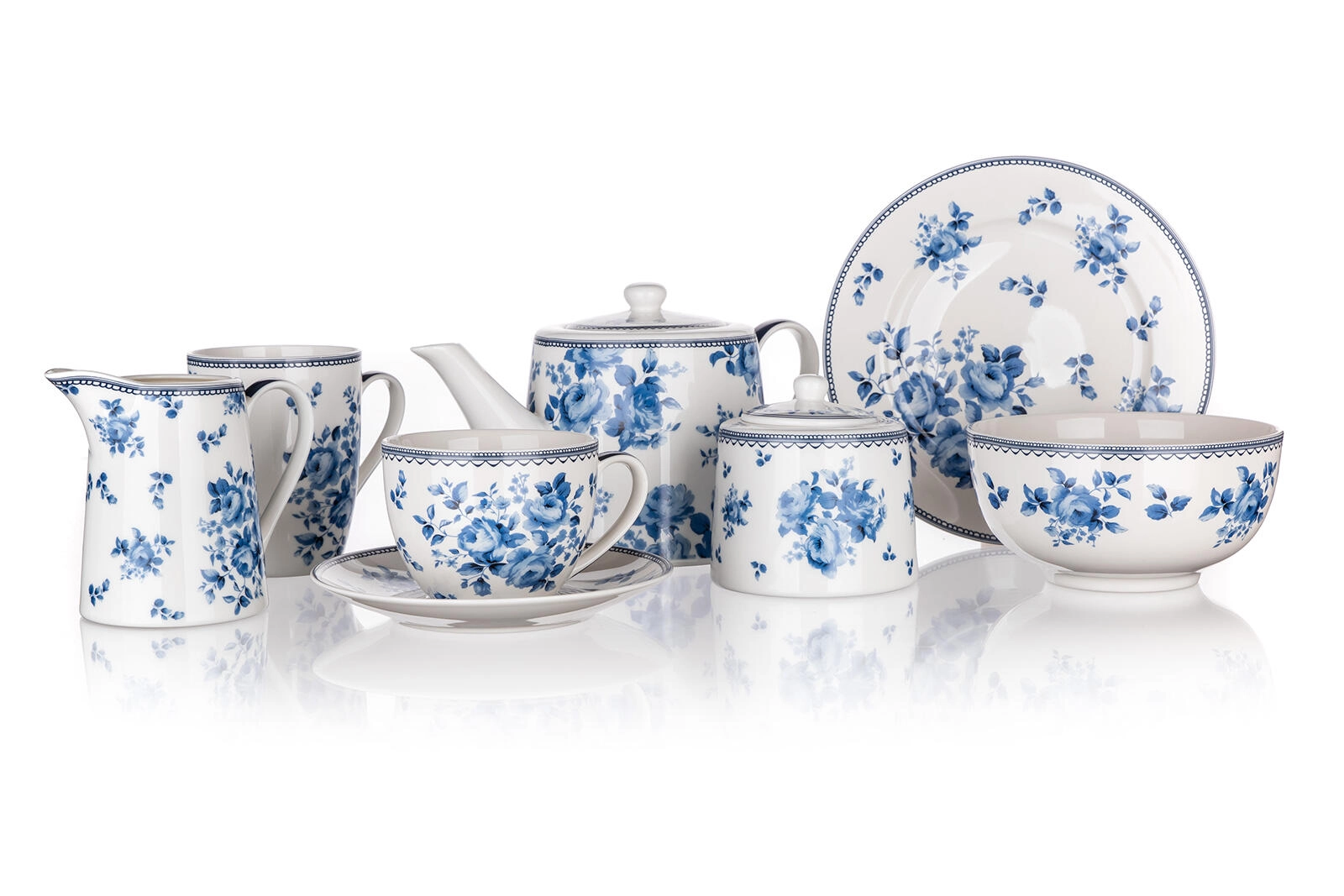 Hvid glasur med blåt, floralt Blue Flower-dekor virker elegant og matcher nemt andet service og et festligt bord.