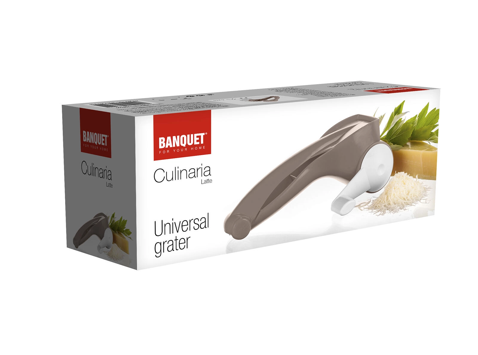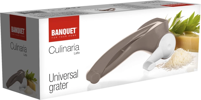 Praktisk universalt rivejern med kværn CULINARIA Latte til hurtig og fin rivning. Den rustfri tromle med en bredde på 7 cm sikrer fine resultater ved bearbejdning af ost, nødder og chokolade. Rivejernet er let at vedligeholde og egnet til både højre- og venstrehåndede.