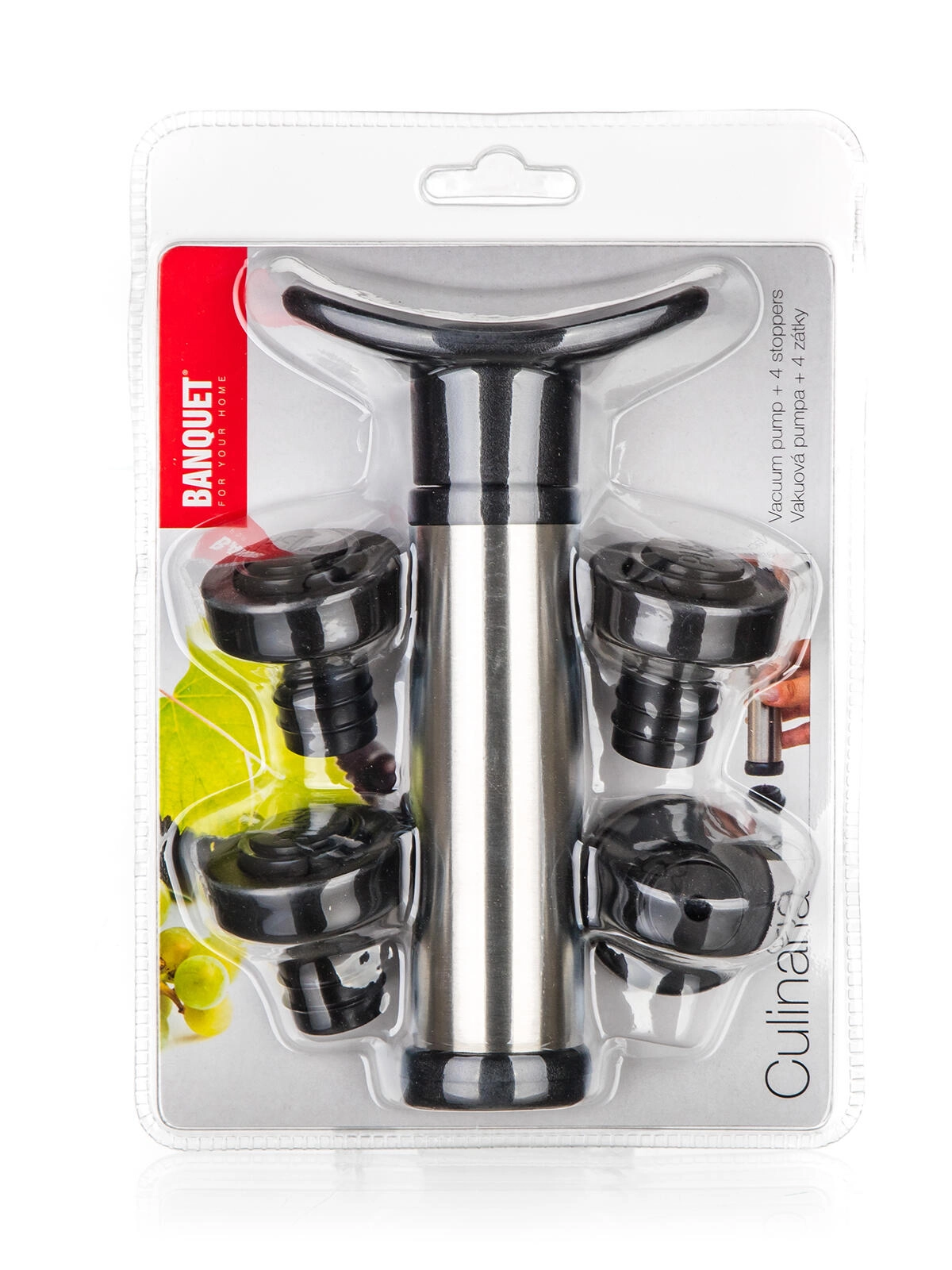 Bevar åbnet vin frisk længere med det praktiske Culinaria-sæt: en vakuumpumpe og fire genanvendelige propper. Ved at fjerne luften fra flasken skaber du et vakuum, som forlænger friskheden, beskytter vinens aroma og smag og minimerer oxidation.