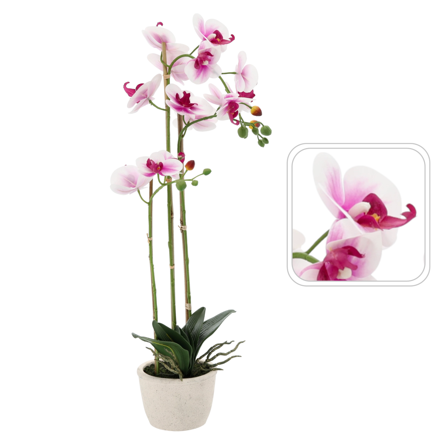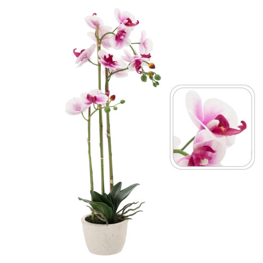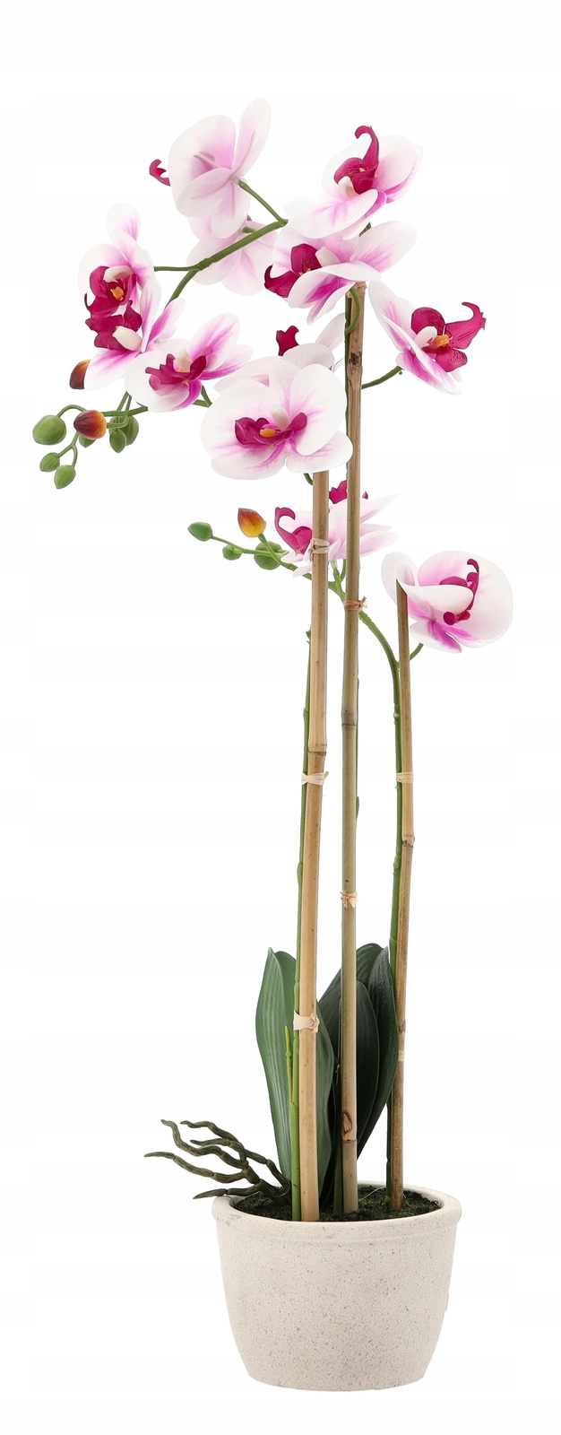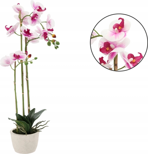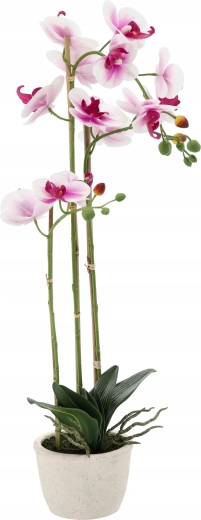 Denne elegante kunstige orkidé i en blid hvid‑rosa farvetone virker meget naturlig takket være de detaljerede blomster, knopper og blade. Højden på 70 cm er ideel til vindueskarme, kommoder eller badeværelser, hvor den tilfører friskhed og stil uden behov for lys eller regelmæssig pleje.