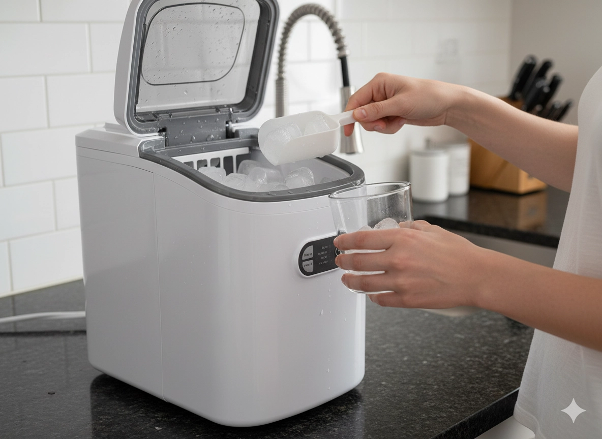 Udviklet til daglig komfort: automatisk rengøring gør vedligeholdelsen nem, det gennemsigtige låg giver overblik over isstatus, og de kompakte mål passer på enhver køkkenbordplade eller på kontoret.