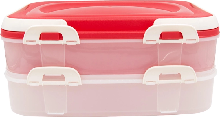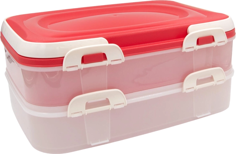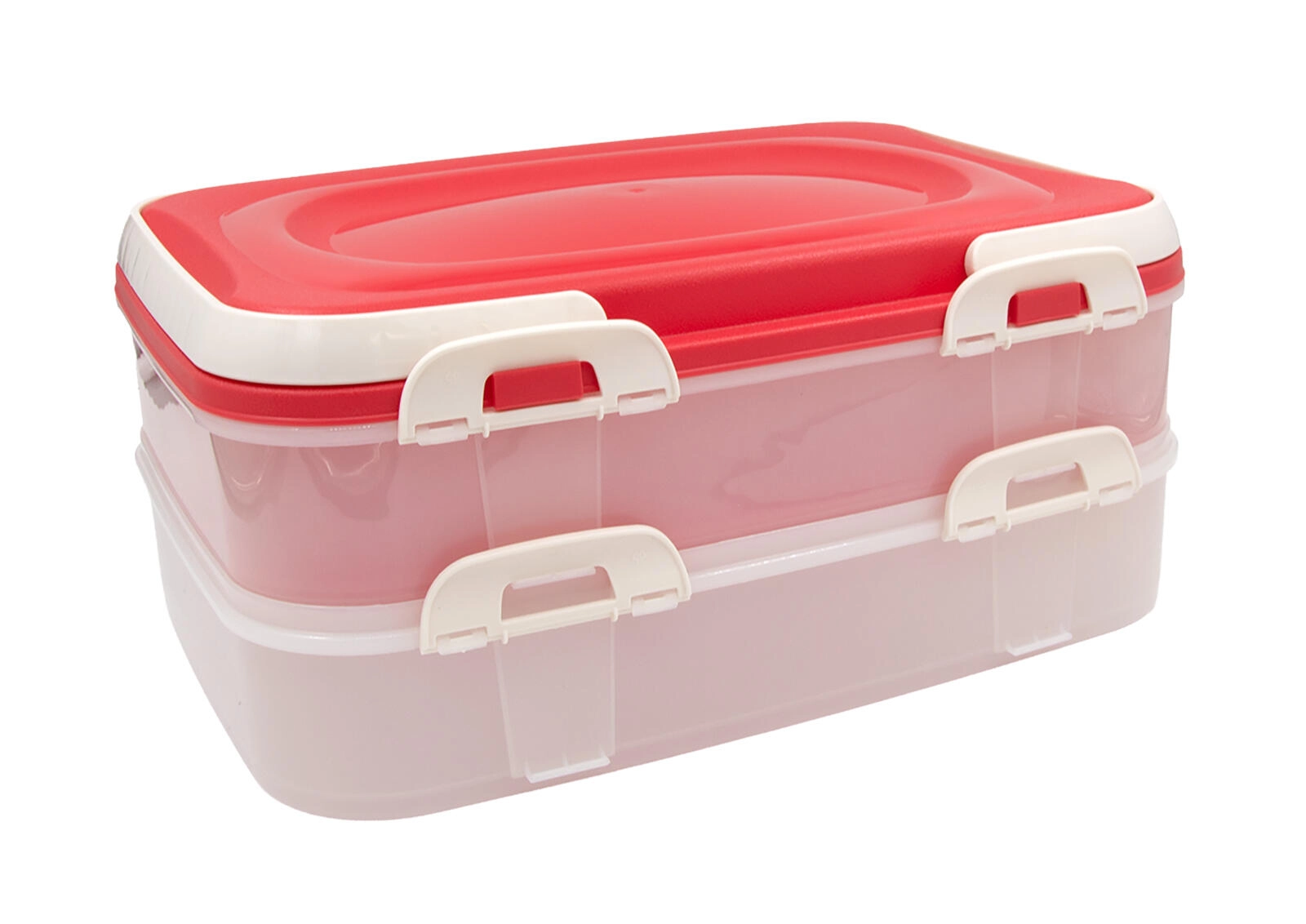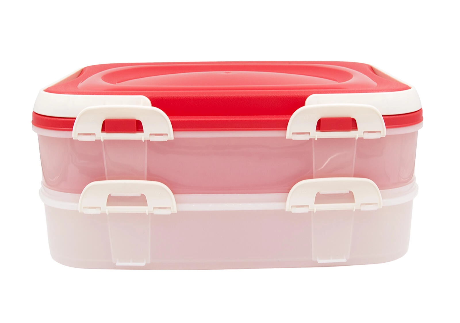 Leder du efter en praktisk boks til sandwiches, kager, frugt eller brød? Denne 2-etagers transportkasse med solide klips og håndtag sørger for, at dine fødevarer ankommer friske og sikkert lukket. Gennemsigtige sider giver hurtig kontrol af indholdet, og det rosa låg tilfører et elegant udtryk til enhver servering.